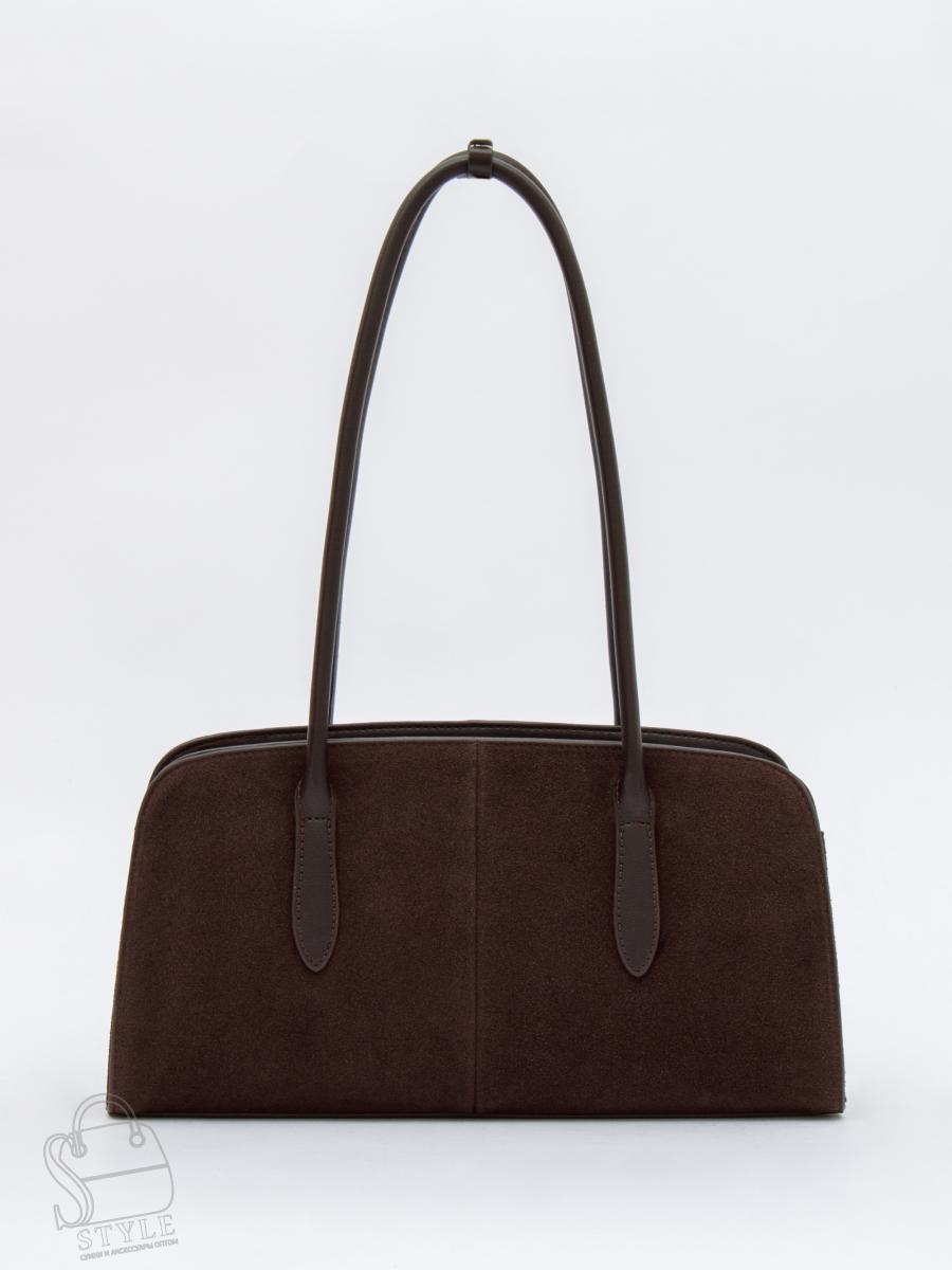 Базовая сумка на каждый день выполнена из натуральной замши. Дополнена серебристой фурнитурой. Основной отдел закрывается на молнию. Сумка носится на плече за удлинённые ручки или через плечо. Каркас полужёсткий.