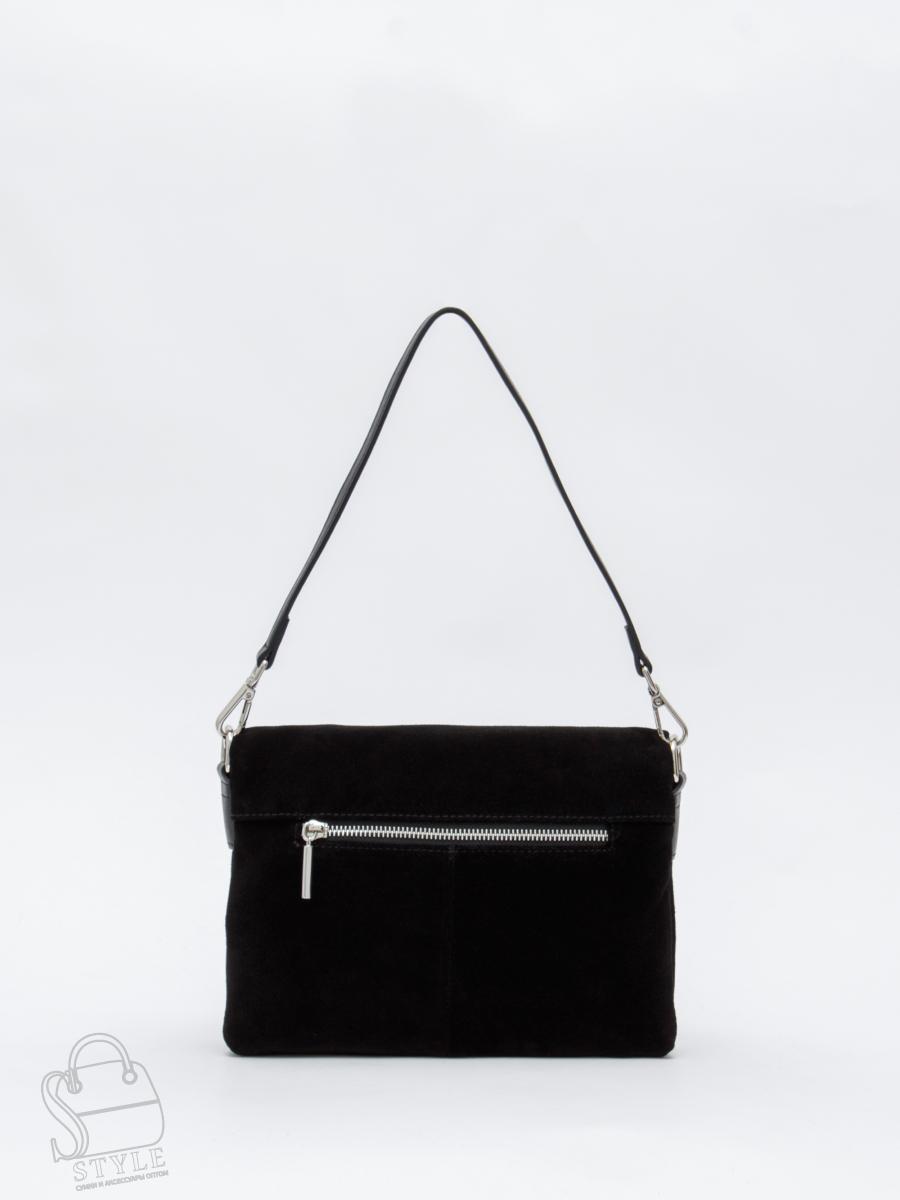 Модель кросс-боди, выполнена из замши. Дополнена серебристой фурнитурой. Данная модель закрывается на клапан. Каркас полужесткий. Носится в руке за съемную удлиненную ручку или на плече. В комплекте имеется съемный ремень с регулировкой длины.
