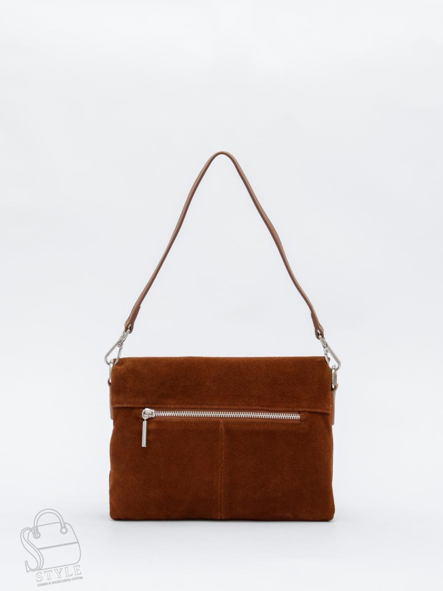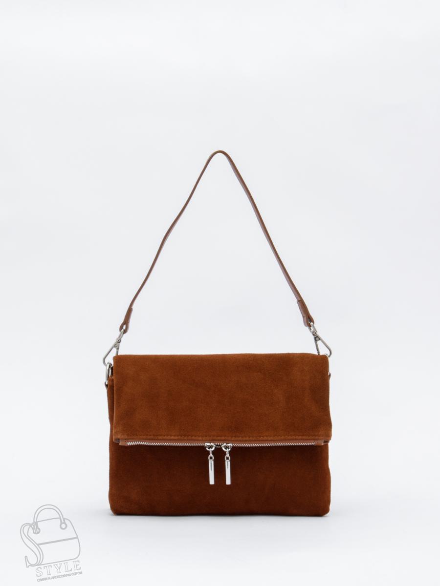 Модель кросс-боди, выполнена из замши. Дополнена серебристой фурнитурой. Данная модель закрывается на клапан. Каркас полужесткий. Носится в руке за съемную удлиненную ручку или на плече. В комплекте имеется съемный ремень с регулировкой длины.