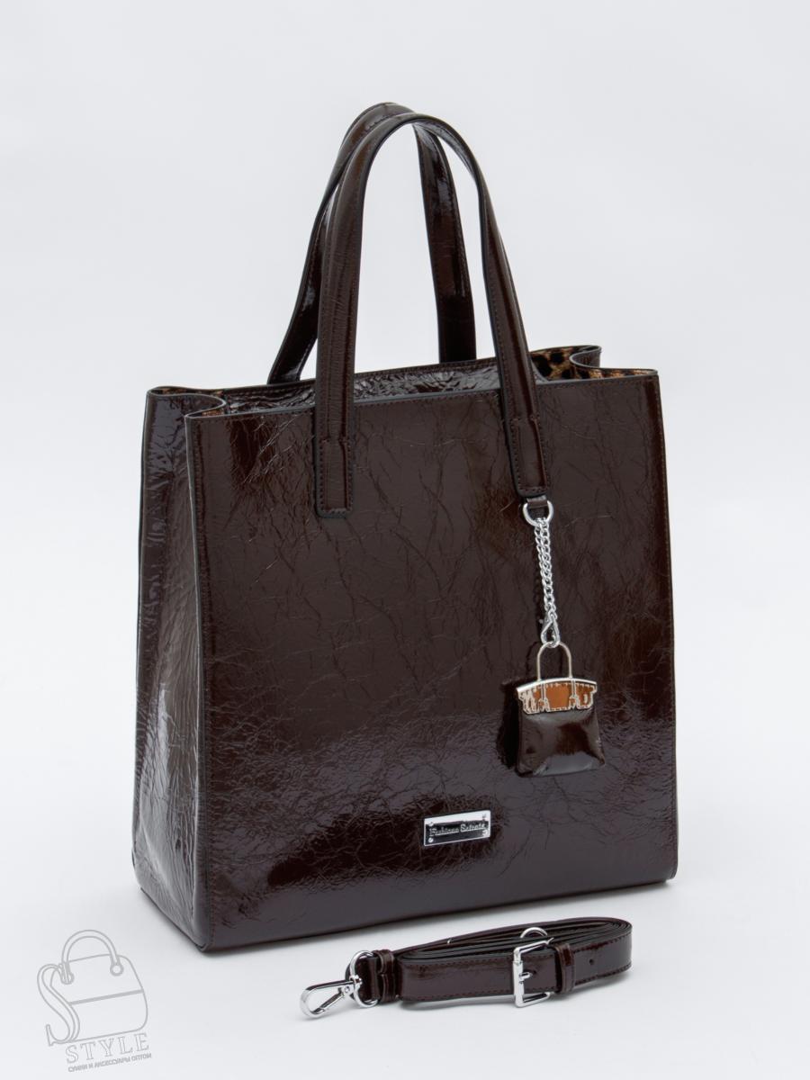 Сумка-тоут, выполнена из кожи. Декорирована брелоком. Дополнена серебристой фурнитурой. Данная модель закрывается на молнию. Каркас полужесткий. Носится в руке за встроенные ручки или на плече. В комплекте имеется съемный ремень с регулировкой длины.