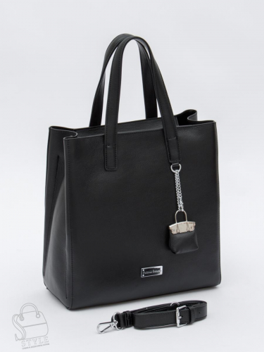 Сумка-тоут, выполнена из кожи. Декорирована брелоком. Дополнена серебристой фурнитурой. Данная модель закрывается на молнию. Каркас полужесткий. Носится в руке за встроенные ручки или на плече. В комплекте имеется съемный ремень с регулировкой длины.