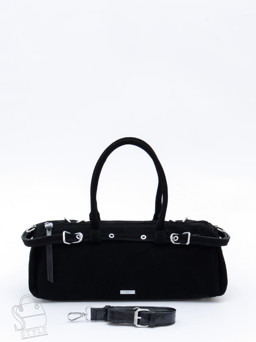 Сумка-багет,  выполнена из замши. Дополнена серебристой фурнитурой. Декорирована ремнем по корпусу. Данная модель закрывается на молнию, носится в руке за встроенные ручки или на плече. В комплекте имеется съемный ремень с регулировкой длины. Каркас полужесткий.