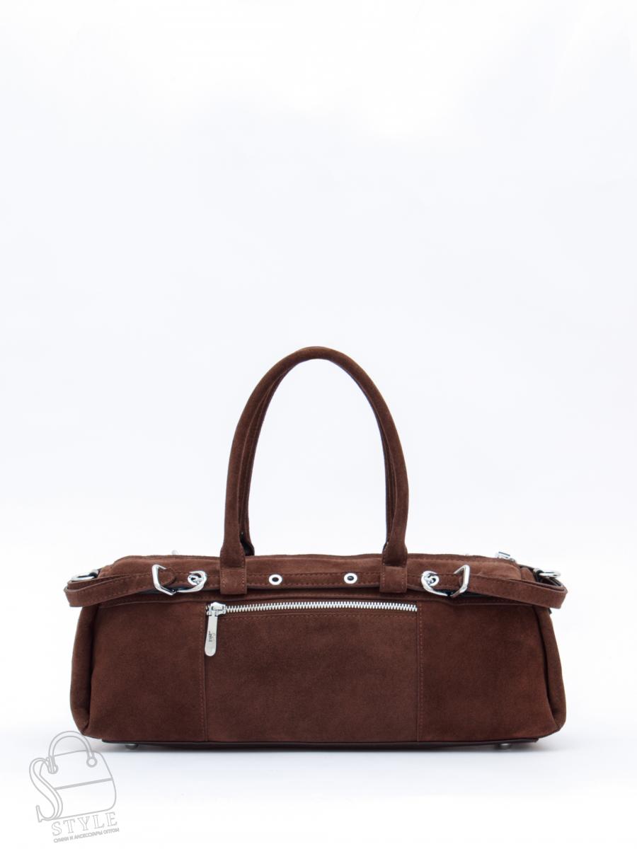 Сумка-багет,  выполнена из замши. Дополнена серебристой фурнитурой. Декорирована ремнем по корпусу. Данная модель закрывается на молнию, носится в руке за встроенные ручки или на плече. В комплекте имеется съемный ремень с регулировкой длины. Каркас полужесткий.