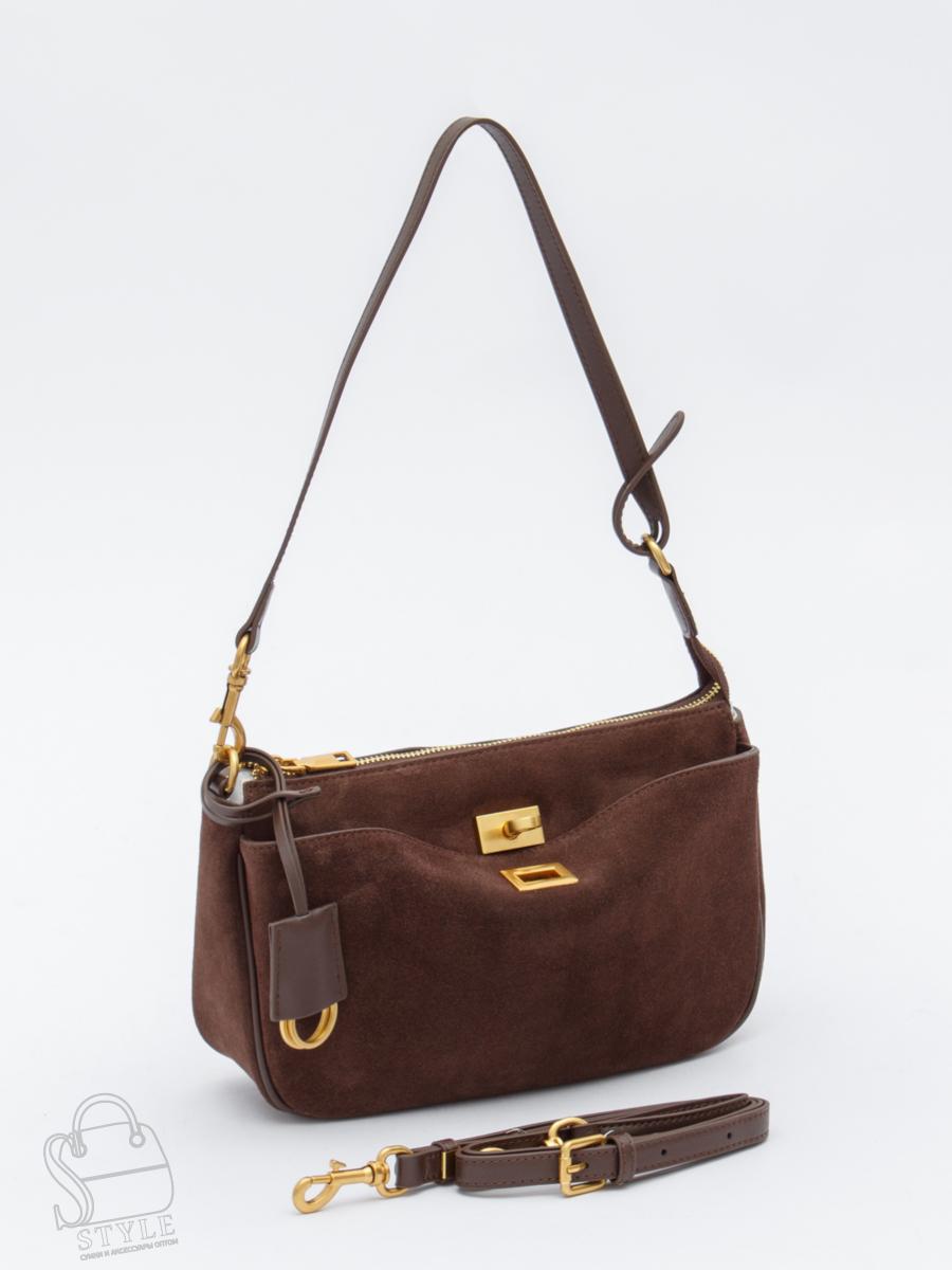 Небольшая базовая модель, выполнена из натуральной замши.  Дополнена золотистой фурнитурой. Данная модель закрывается на молнию. Каркас полужесткий. Носится в руке за съемную ручку или на плече. Плечевой ремень регулируется по длине.
