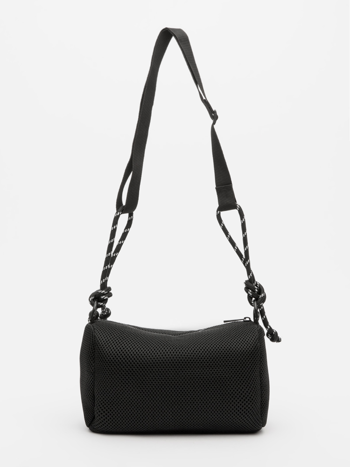 Её лаконичная форма бочонка из 3D-сетки выглядит современно и невесомо. Длинный регулируемый ремень с декоративными узлами добавляет образу лёгкую небрежность, сохраняя функциональность.