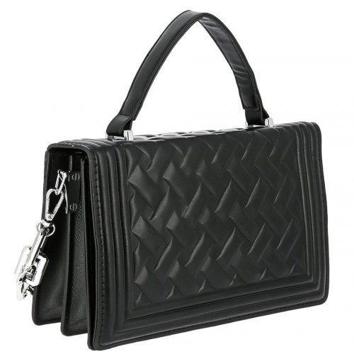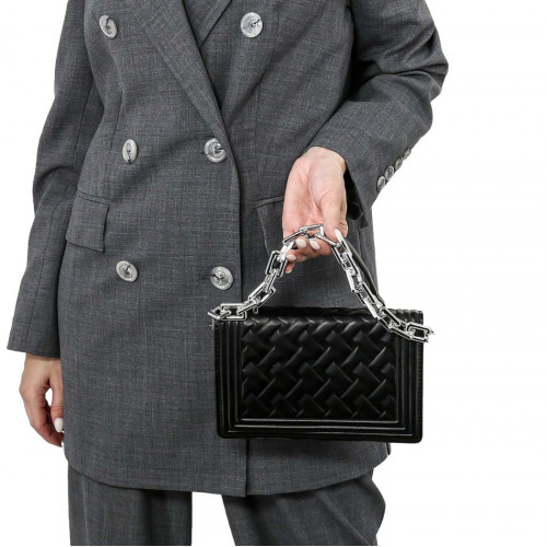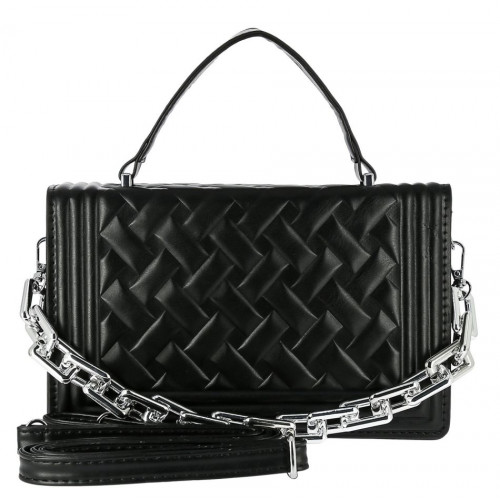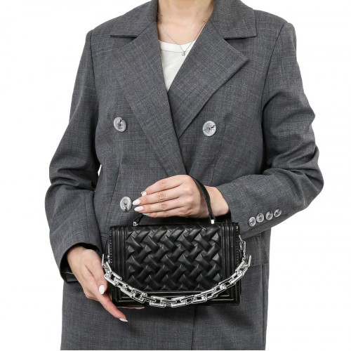 Внутри: три отделения, среднее на молнии. Сумка закрывается на крышку-клапан с двумя крепкими кнопками-магнитами. В комплекте удобная съёмная ручка-цепочка и удлинённый наплечный ремень, регулируемый по высоте. Модель хорошо держит форму.