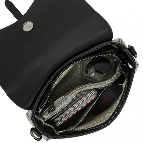 Внутри: одно большое отделение, на боковых стенках которого расположены карманы: один на молнии, один открытый. В комплекте удлинённый, регулируемый по высоте, наплечный ремень. Модель хорошо держит форму. Сумка закрывается на молнию и крышку-клапан с крепким замком-магнитом.