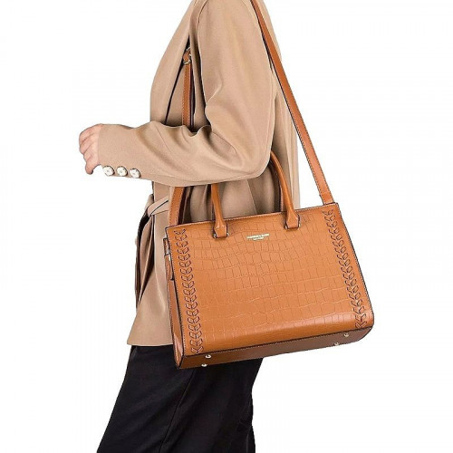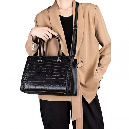 Внутри: три отделения, среднее закрывается на молнию. По бокам расположены карманы на молнии и без для документов, телефона и всяких мелочей. На внешней задней стенке так же имеется карман на молнии. Сумка закрывается на молнию. В комплекте удлинённый ремень, регулируемый по высоте. На дне имеются металлические ножки, защищающие сумку от потёртостей.