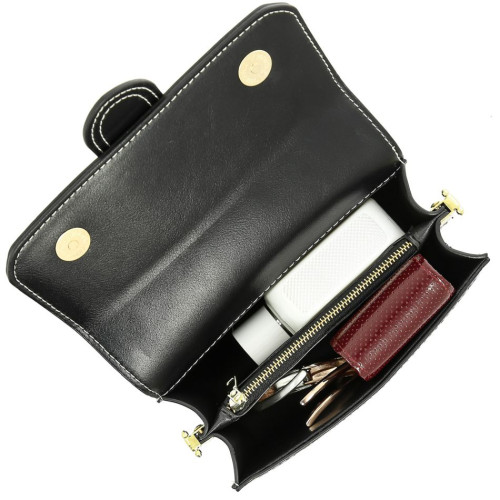 Внутри: три отделения, среднее закрывается на молнию. В комплекте удлинённый наплечный ремень, регулируемый по высоте. Модель прекрасно держит форму. Сумка закрывается крышкой-клапаном с двумя крепкими кнопками-магнитами.