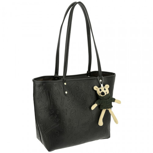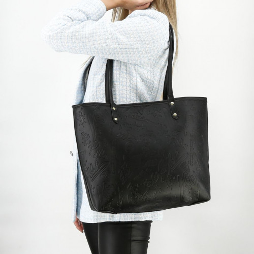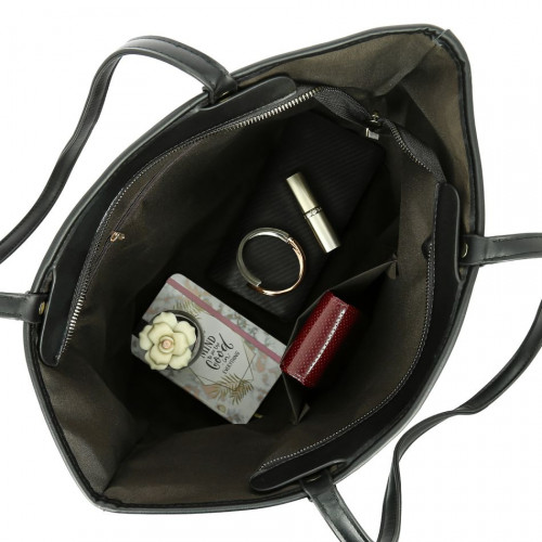 Внутри: одно большое отделение. На боковых стенках имеются два кармана: один на молнии и один открытый для документов, телефона и мелочей. Сумка закрывается на молнию. За счёт длины ручек сумку можно носить как в руке, так и на плече. В комплекте оригинальный брелок.