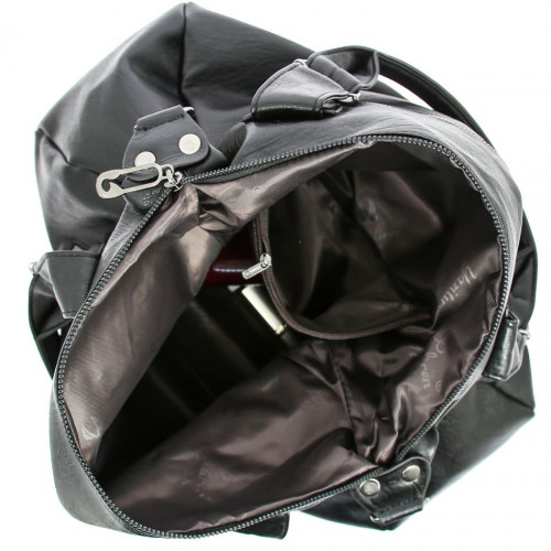 Внутри: одно большое отделение с карманами на боковых стенках - один на молнии и один открытый для телефона, документов и мелочей. На внешней задней стенке расположен один карман на молнии. На лицевой стороне один открытый карман и два на молнии. В комплекте удлиненный наплечный ремень, регулируемый по высоте. Сумка закрывается на молнии.
