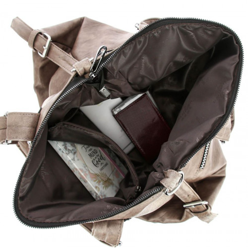 Внутри: одно большое отделение. На внутренних стенках сумки имеются карманы: один на молнии и один открытый, которые служат для переноски и хранения телефона, документов и разных мелочей. На внешней задней стенке имеется карман, который закрывается на молнию. На внешней лицевой стороне так же присутствуют карманы на молнии. В комплекте идёт удлиненный, регулируемый по высоте, наплечный ремень. Сумка закрывается на молнию.
