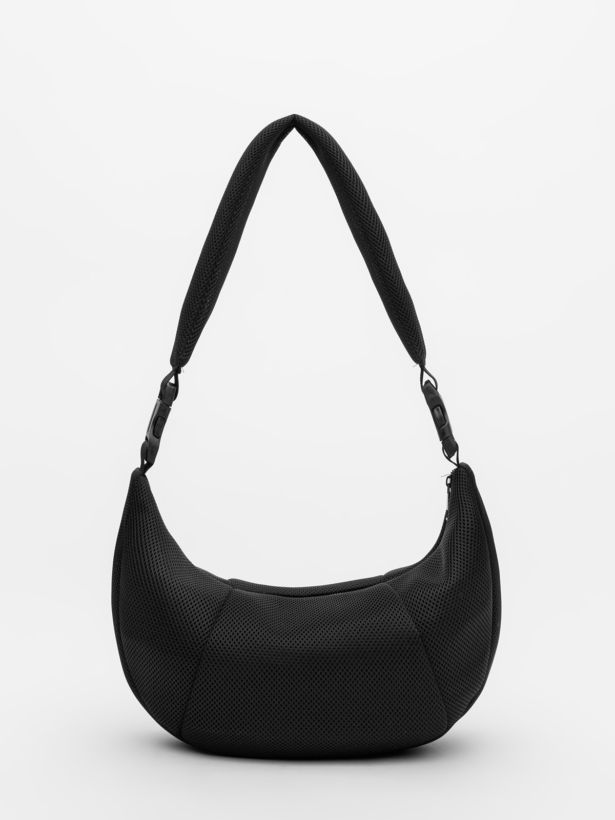 Её мягкий объёмный крой, форма полумесяца и тактильно приятная ручка создают невесомый образ, удобный для ношения на плече. Благодаря фастексам ручка легко отсоединяется, превращая сумку в компактный аксессуар для руки — два образа в одной модели.