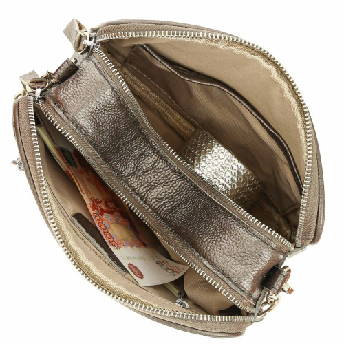 Внутри: два самостоятельных отделения, закрывающихся на молнии. На боковых стенках отделений расположены карманы: один на молнии и один открытый для документов, телефона и мелочей. С внешней стороны на задней и на передней стенках так же имеются карманы на молнии. В комплекте удлинённый наплечный ремень и съёмная ручка.