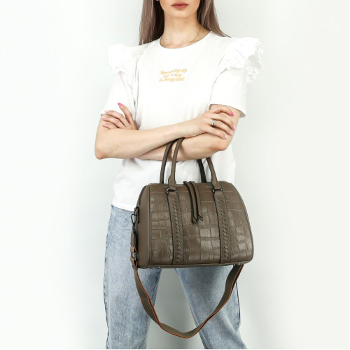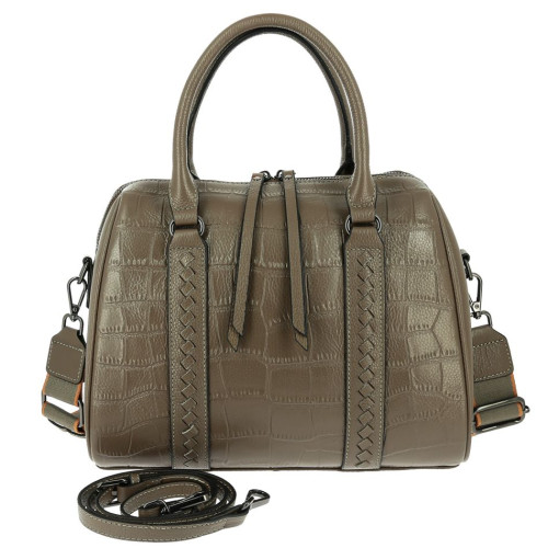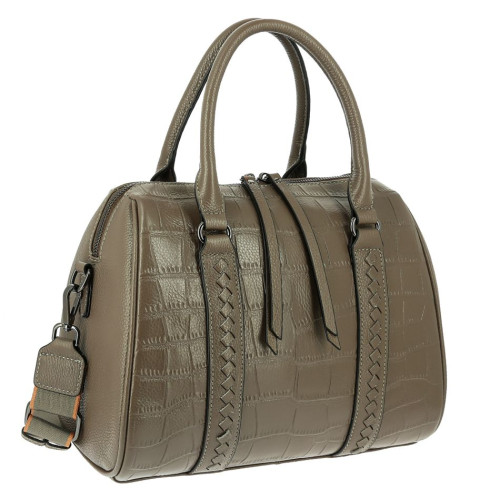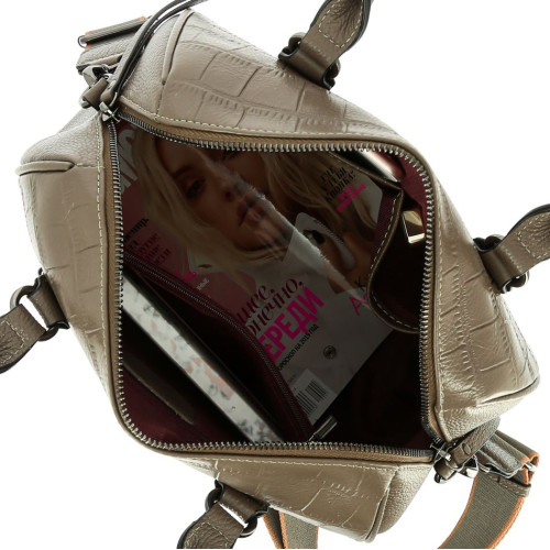 Внутри: одно большое отделение с боковыми карманами: два на молнии и три открытых для телефона, документов и мелочей. С внешней стороны на задней стенке карман на молнии. В комплекте два удлинённых наплечных ремня: один из натуральной кожи, второй из высококачественного прочного текстиля. На дне сумки расположены металлические ножки, предохраняющие от потёртостей. Модель хорошо держит форму. Сумка закрывается на встречную молнию.