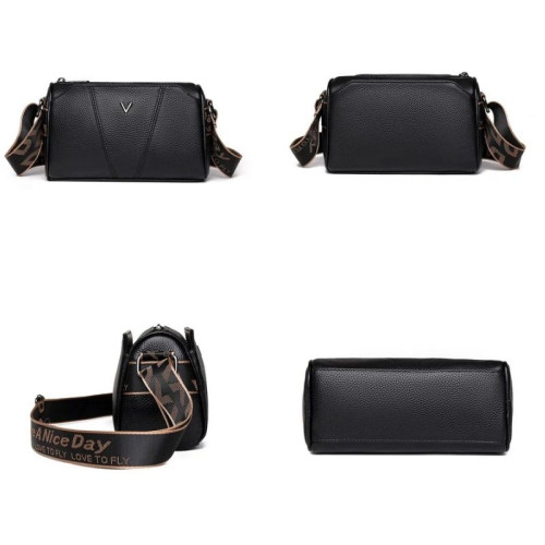 Внутри: три отделения, центральное на молнии. По бокам центрального отделения расположены карманы на молнии и без для телефона, документов и различных мелочей. Боковые отделения закрываются на крепкие кнопки-магниты. В комплекте удлиненный текстильный ремень, регулируемый по высоте.