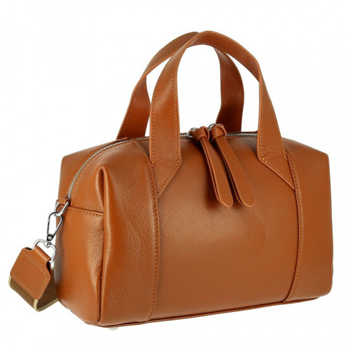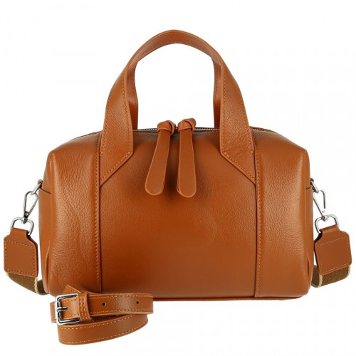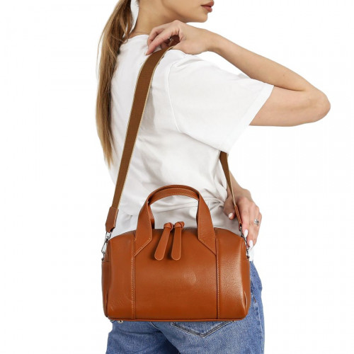 Внутри: одно вместительное отделение с боковыми карманами: два на молнии и два открытых для документов, телефона и мелочей. На дне сумки расположены металлические ножки, предохраняющие от потёртостей. В комплекте два удлинённых наплечных ремня: один из натуральной кожи, второй из высокопрочного текстиля. Модель хорошо держит форму. Сумка закрывается на встречную молнию.