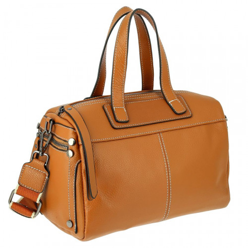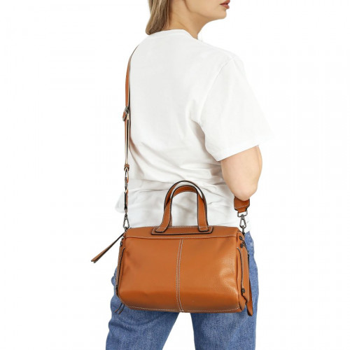 Внутри: одно большое отделение. На боковых стенках расположены карманы для документов, телефона и мелочей - два на молнии и два открытых. С внешней стороны на задней стенке карман на молнии. На боковых стенках два глубоких кармана на молниях. В комплекте два удлинённых, регулируемых по высоте, наплечных ремня - один из натуральной кожи, второй из высокопрочного текстиля. Сумка закрывается на молнию.