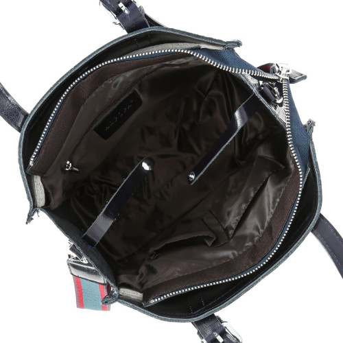 Внутри: одно большое отделение с карманами на молнии и без для документов, телефона и мелочей, и два боковых отделения на крепких кнопках-магнитах. В комплекте два наплечных ремня: один из натуральной кожи, регулируемый по высоте. Второй ремень из высококачественного текстиля, который может отличаться расцветкой от заявленной на фото. На дне сумки расположены металлические ножки, предохраняющие от потёртостей. Модель хорошо держит форму. Сумка закрывается на молнию.