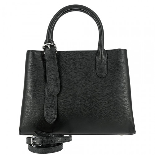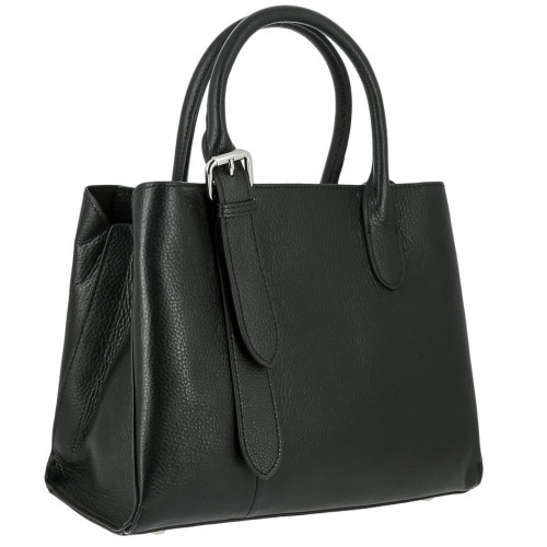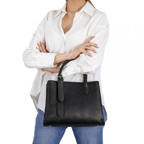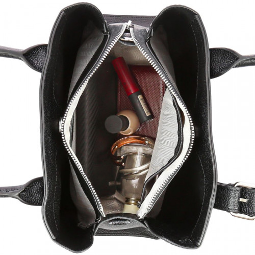 Внутри: три самостоятельных отделения - среднее закрывается на молнию, а два других закрываются на крепкие кнопки-магниты. По бокам среднего отделения расположены карманы: один на молнии и один открытый для документов, телефона и мелочей. В комплекте удлинённый наплечный ремень. На дне сумки расположены металлические ножки, предохраняющие от потёртостей. Модель хорошо держит форму. Сумка закрывается на молнию.