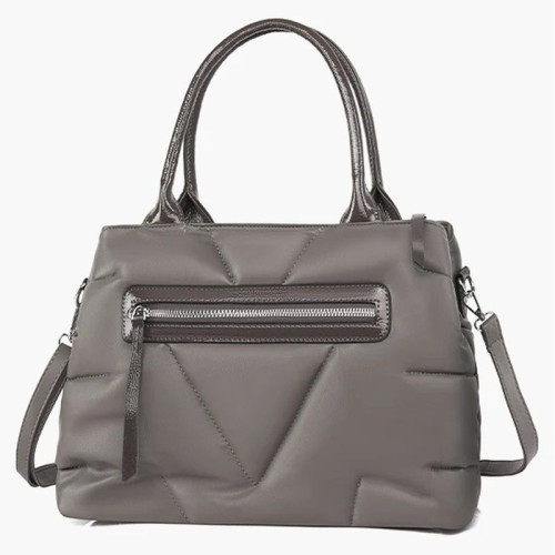 Внутри: два самостоятельных отделения. По бокам расположены карманы на молнии и без для телефона, документов и различных мелочей. Сумка закрывается на молнию. На внешней передней стенке имеется молния без кармана. На дне сумки расположены металлические ножки для устойчивости и защиты от потёртостей. В комплекте удлинённый ремень, регулируемый по высоте.