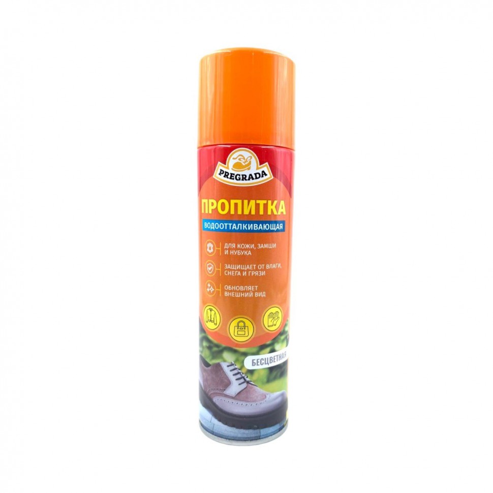PREGRADA аэрозоль водоотталкивающая пропитка предназначена для защиты гладкой кожи, замши, нубука и ткани от воздействия влаги, снега и грязи. Перед применением рекомендуется очистить поверхность изделия. Для тестирования средства перед использованием рекомендуется применить на незаметном месте изделия.