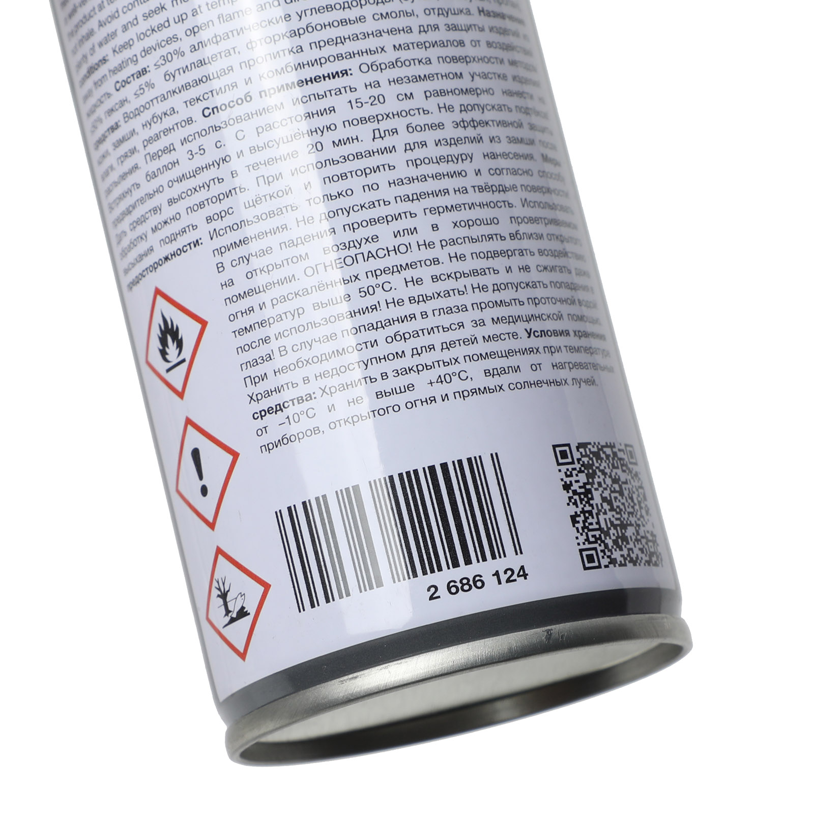 * Способ применения: очистите поверхность от грязи, встряхните баллон, равномерно нанесите на изделие с расстояния 15-20 см. Дайте высохнуть 20 мин.