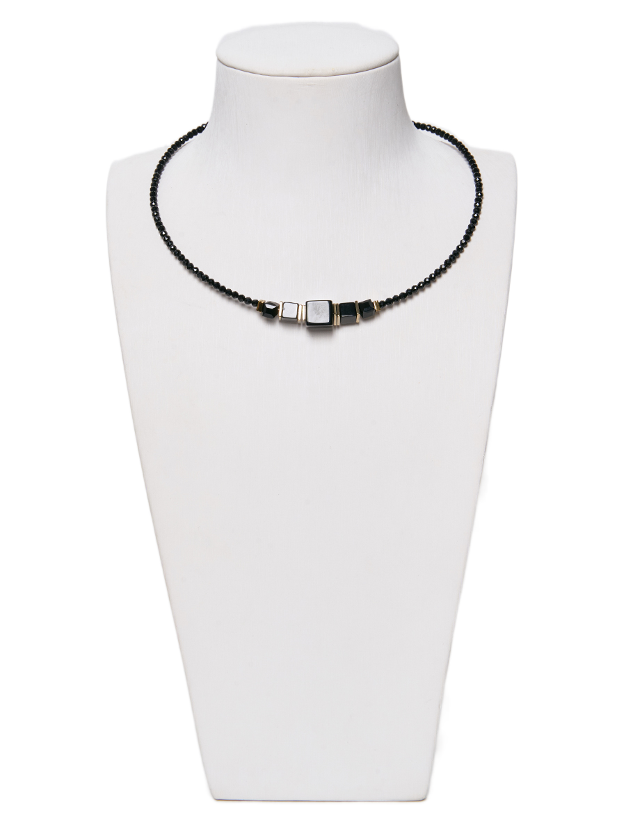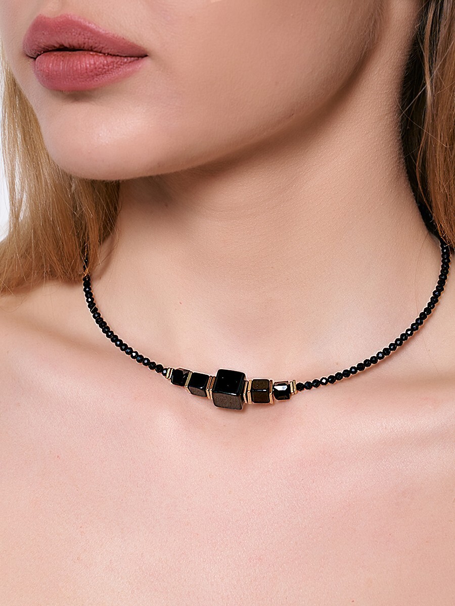 Оникс, гематит, хрустальное стекло, ювелирный сплав. Гальваническое покрытие: золото.