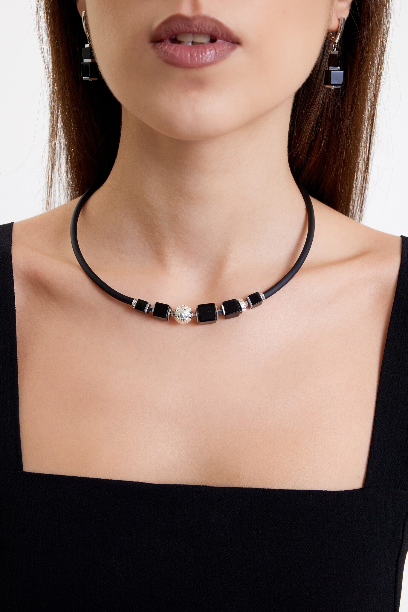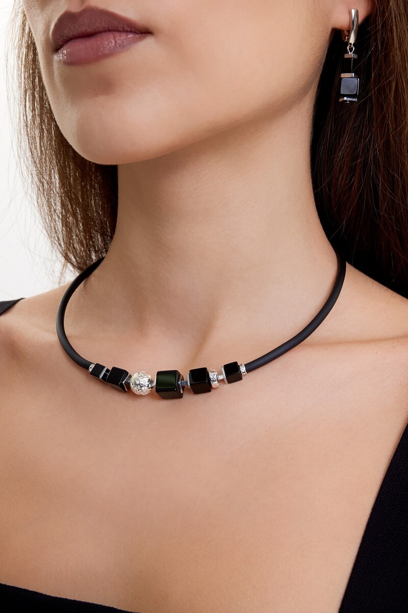 Вулканическая лава, оникс, гематит, каучук, кристаллы Preciosa, ювелирный сплав. Гальваническое покрытие: родий.