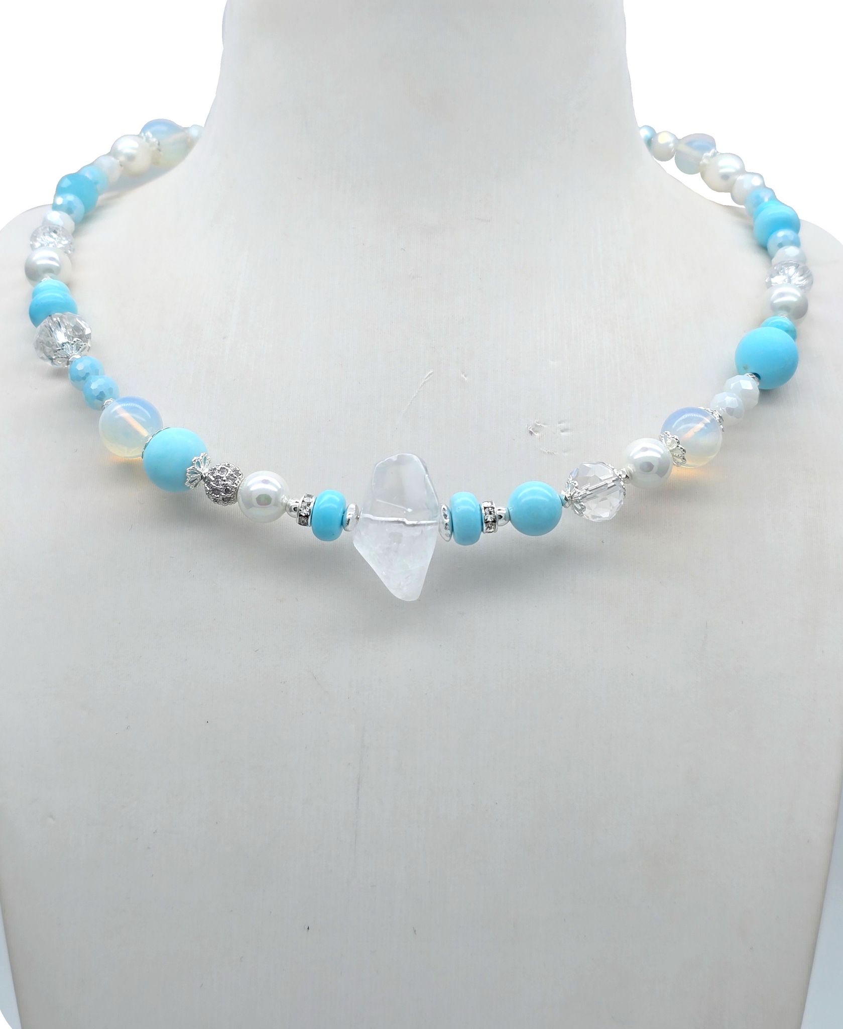 Размер: Длина колье 42 - 47 см. Жемчуг Майорка 6;8 мм, горный хрусталь 14*22 мм, лунный кварц 10 мм.