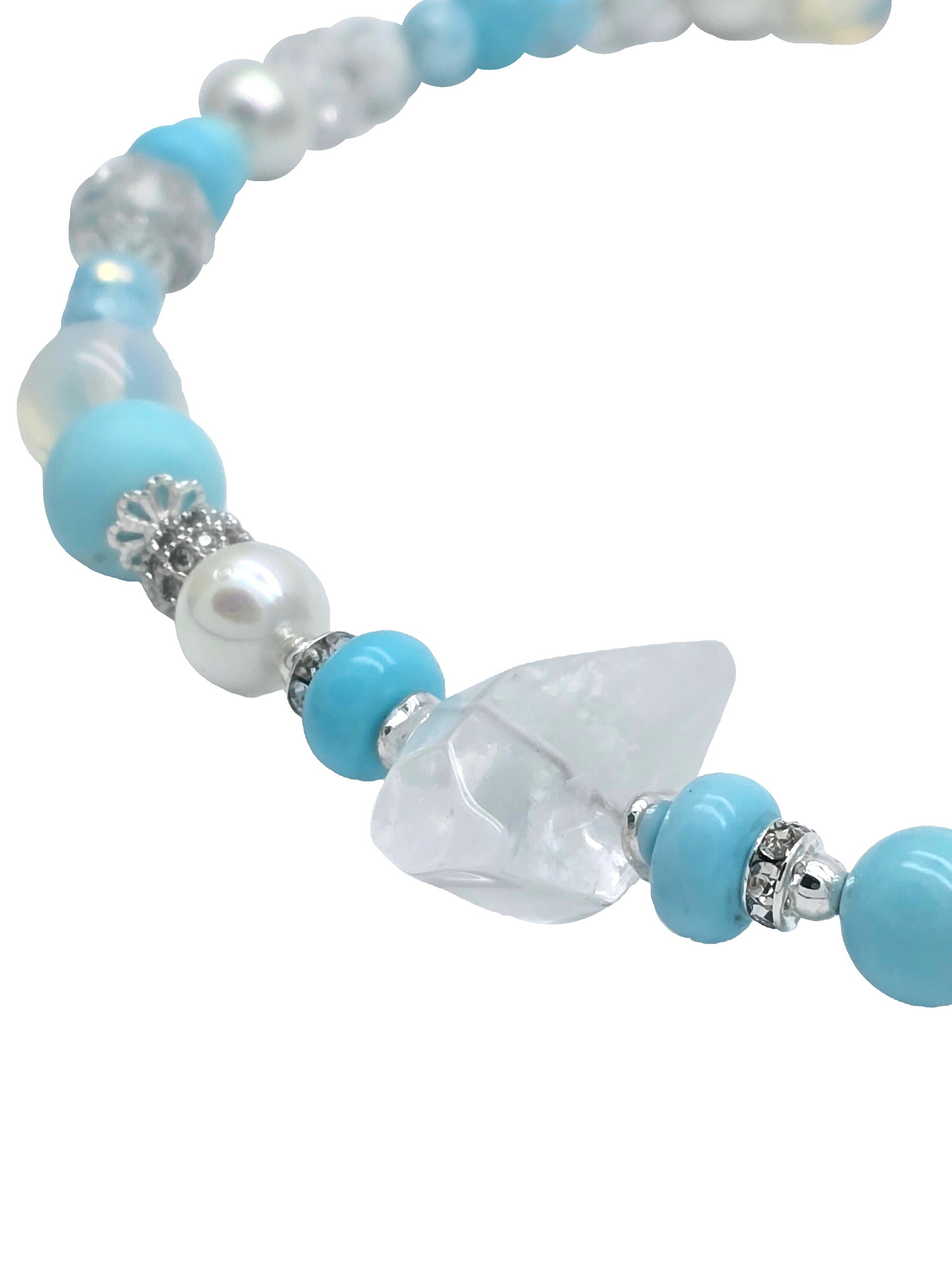 Горный хрусталь, турквенит, лунный кварц, жемчуг Майорка, хрустальное стекло, стразы, ювелирный сплав. Гальваническое покрытие: родий.