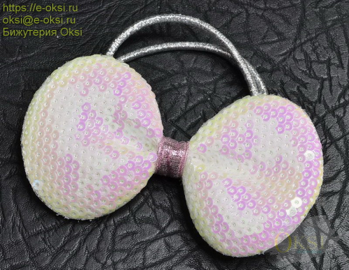 Яркий, качественный бант на резинке, украшен сверкающими пайетками белого цвета. Внутри банта прослойка из полорона, что создает дополнительный объем . Размер банта 8,5 см х 5 см. Диаметр резинки 5 см. Производство Корея.
