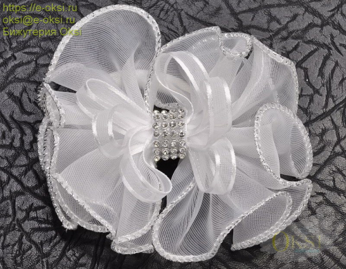Красивый нарядный бант из органзы, украшен блестящей серебристо1 нитью. Размер 8 см х 7 см. Производство Корея.