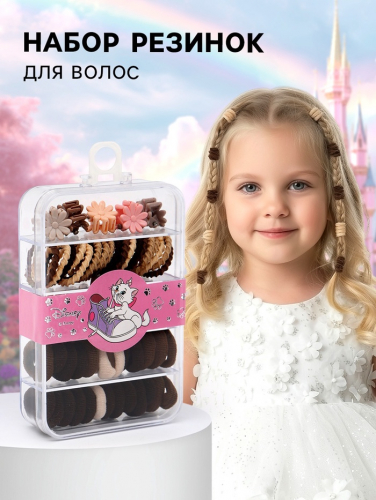 Удобный набор аксессуаров для девочек от 3 лет — всё собрано в одном компактном контейнере с крышкой и ручкой для переноски. Включает 3 вида резинок и заколок.