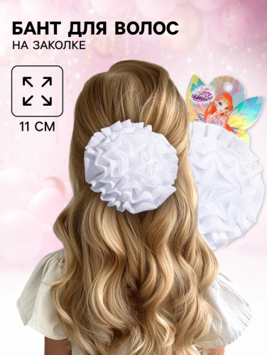 Праздничный бант для девочек от 3 лет. Изготовлен из многослойного белого тюля с мелкими блёстками и декоративной розой в центре. Крепится на эластичную резинку — удобно и надёжно. Подходит для повседневного использования, праздников и фотосессий. В упаковке — изображение героини из мультсериала.