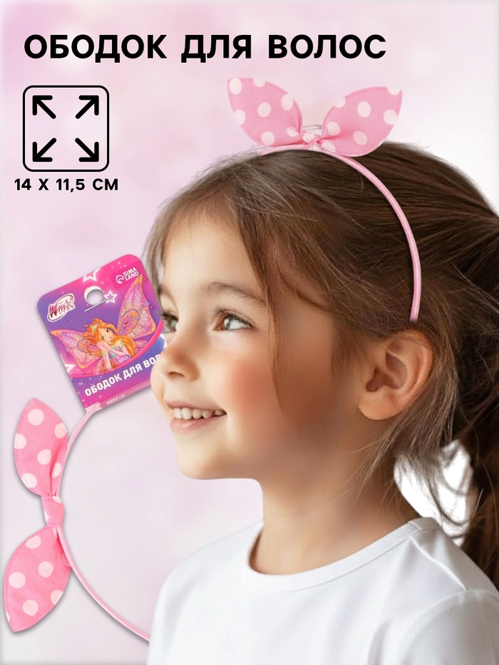 Ободок для волос «Бантик» в горошек из коллекции Винкс — элегантный и игривый аксессуар для юной принцессы! Нежно-розовый ободок украшен стильным бантом в белый горошек, вдохновлённым модным шармом любимых фей — Стеллы, Блум и других героинь Винкс-клуба. Мягкая основа бережно фиксирует причёску, не давит и не оставляет заломов, а дизайн добавляет образу кокетства и сказочного настроения. Идеален для утренников, праздников или повседневного ношения. Пусть каждый день будет таким же ярким, уверенным и волшебным, как сама Винкс!