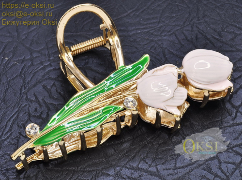 Очень красивая металлическая заколка цветочной формы, украшена ювелирной эмалью и кристаллами. Качественное гальваническое покрытие золотого цвета. Длина заколки 11,5 см.