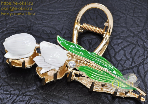 Красивая металлическая заколка цветочной формы, украшена бледно - розовой ювелирной эмалью и кристаллами. Качественное гальваническое покрытие золотого цвета. Длина заколки 11,5 см.