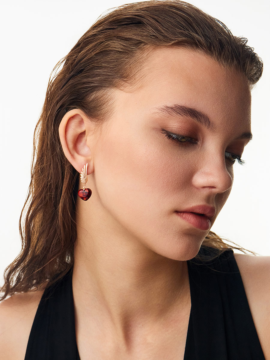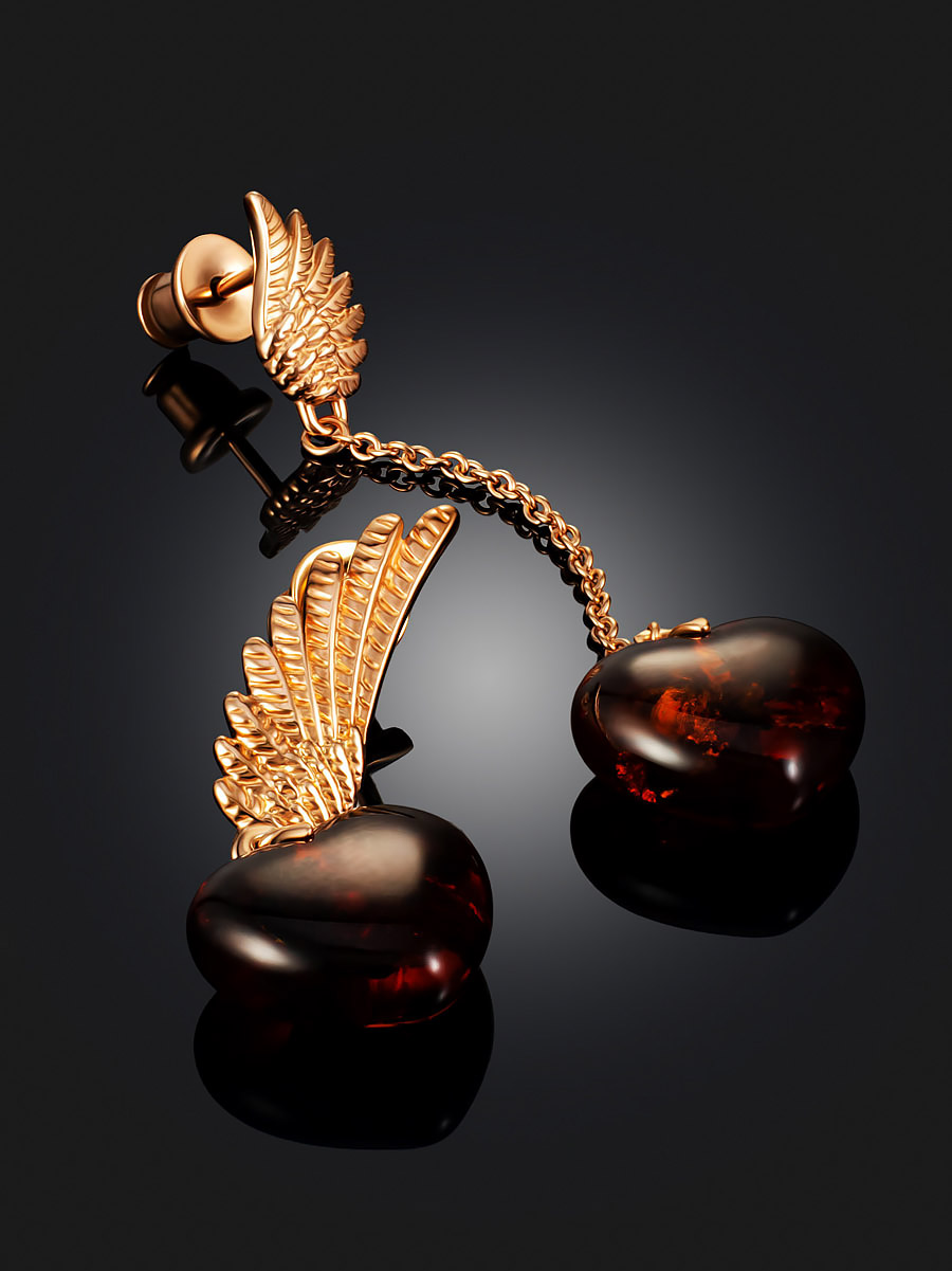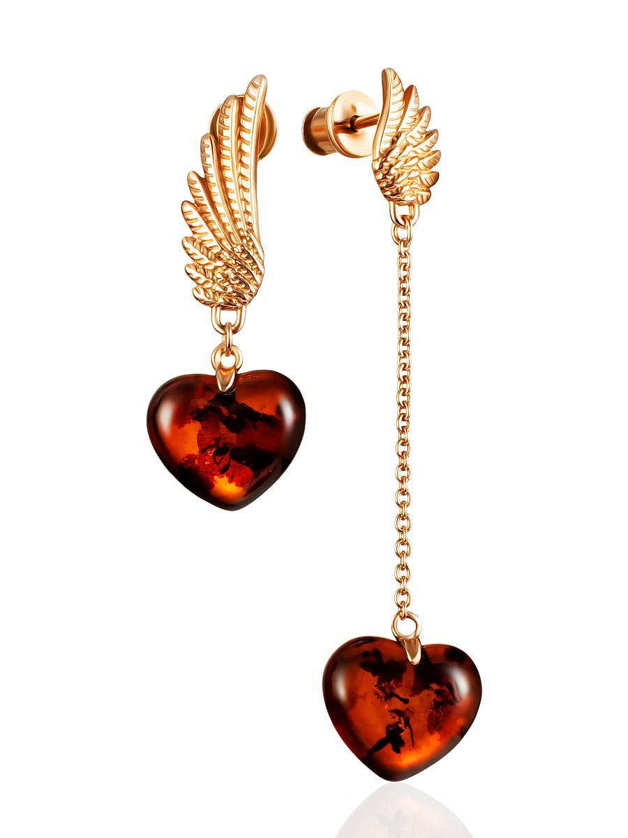 Асимметричные янтарные серьги «Сердце» с позолоченными крыльями