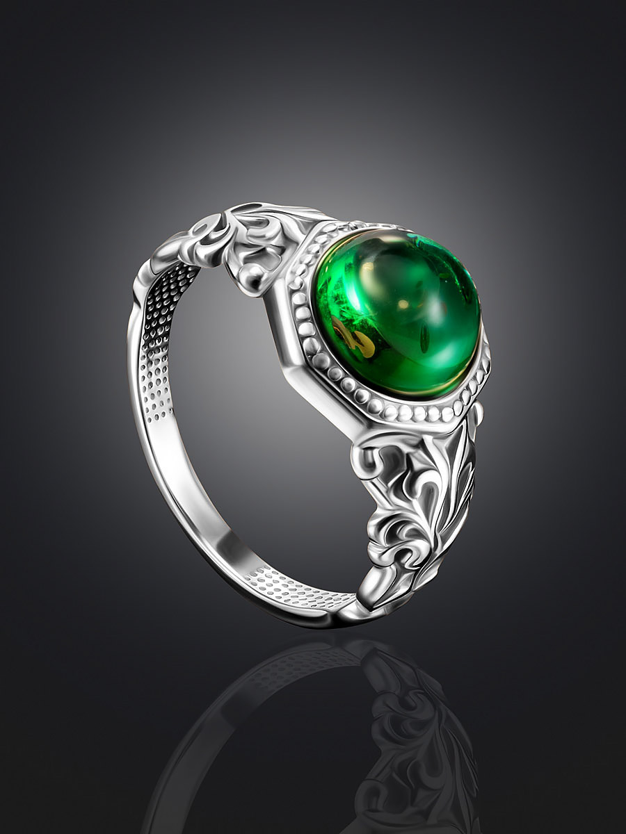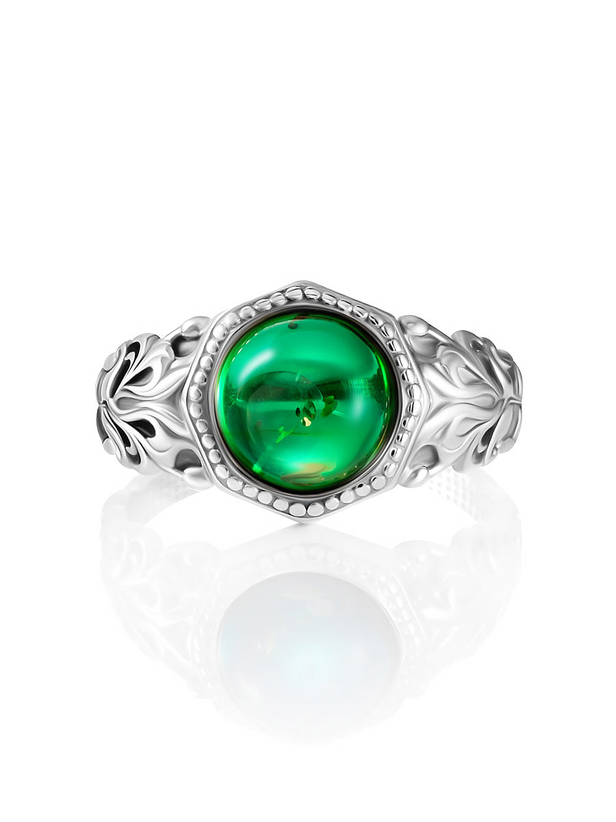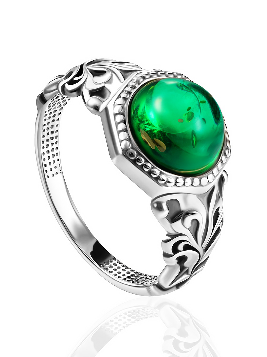 Ажурное кольцо с натуральным янтарём изумрудно-зелёного оттенка «Шахерезада»