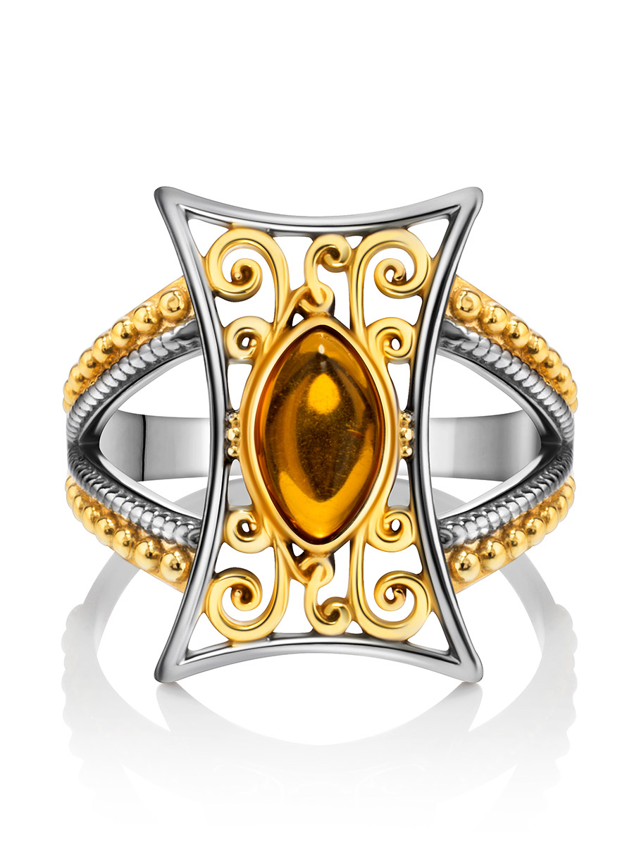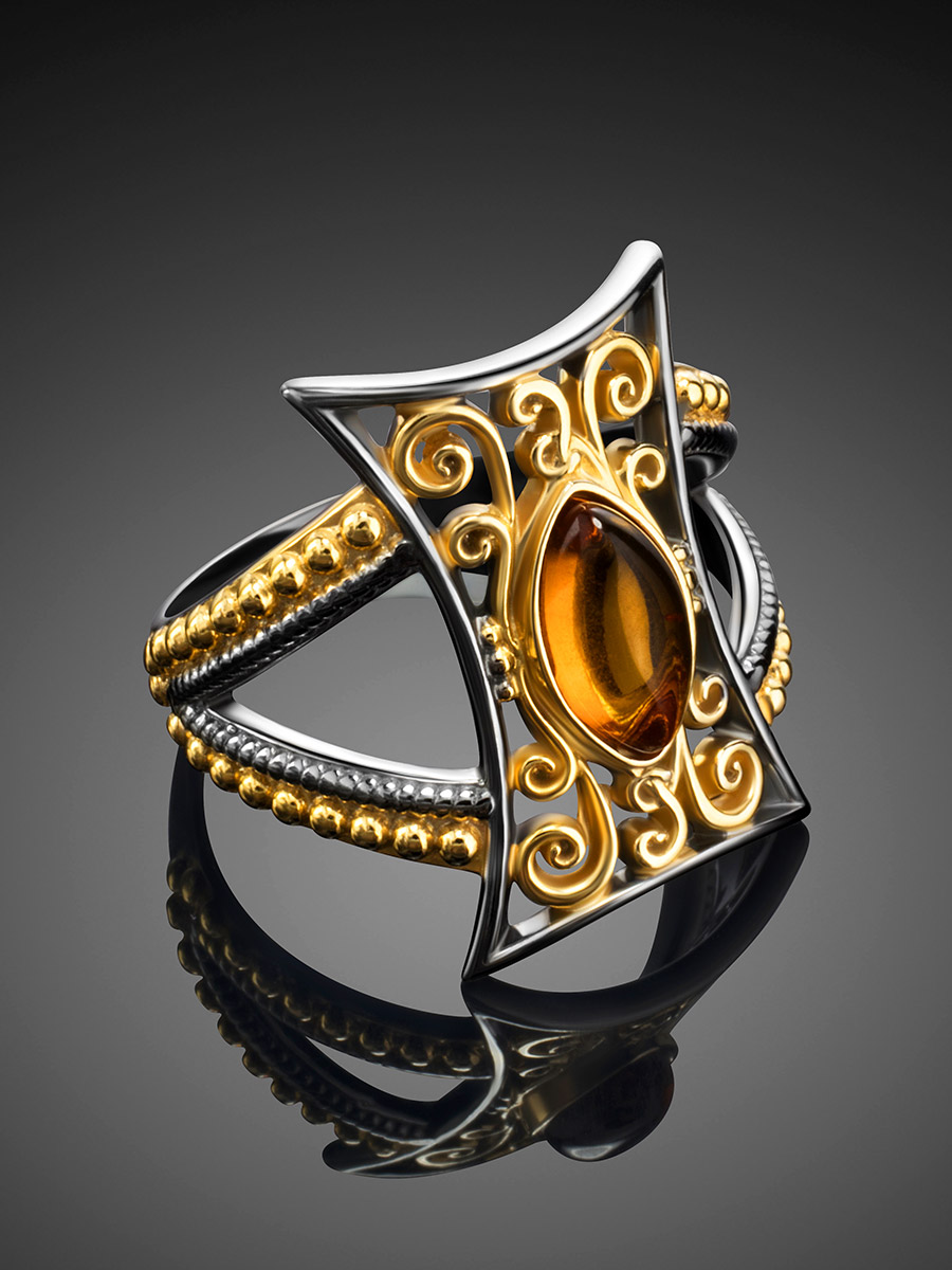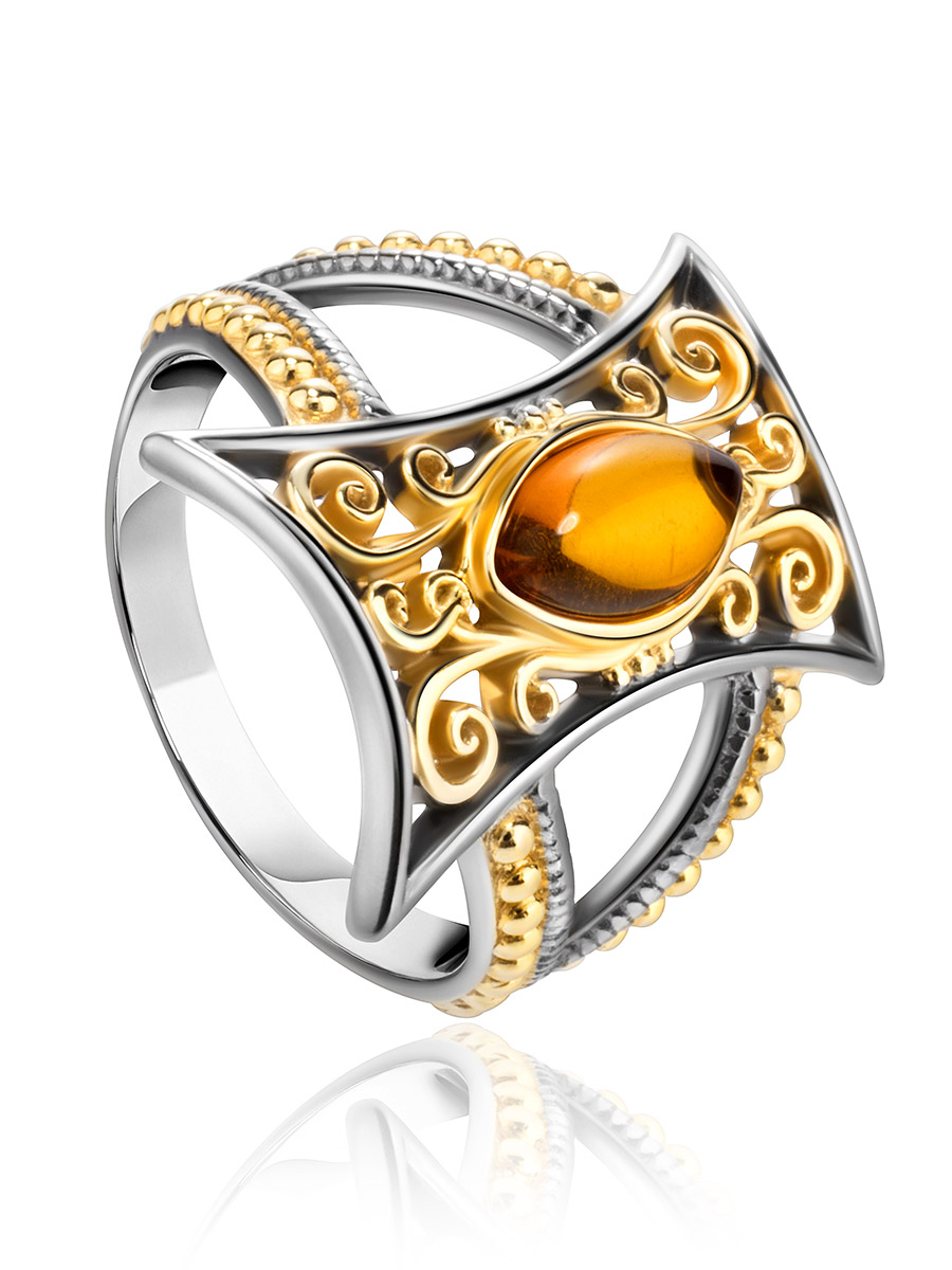 Ажурное кольцо, украшенное натуральным коньячным янтарём «Арабеска»