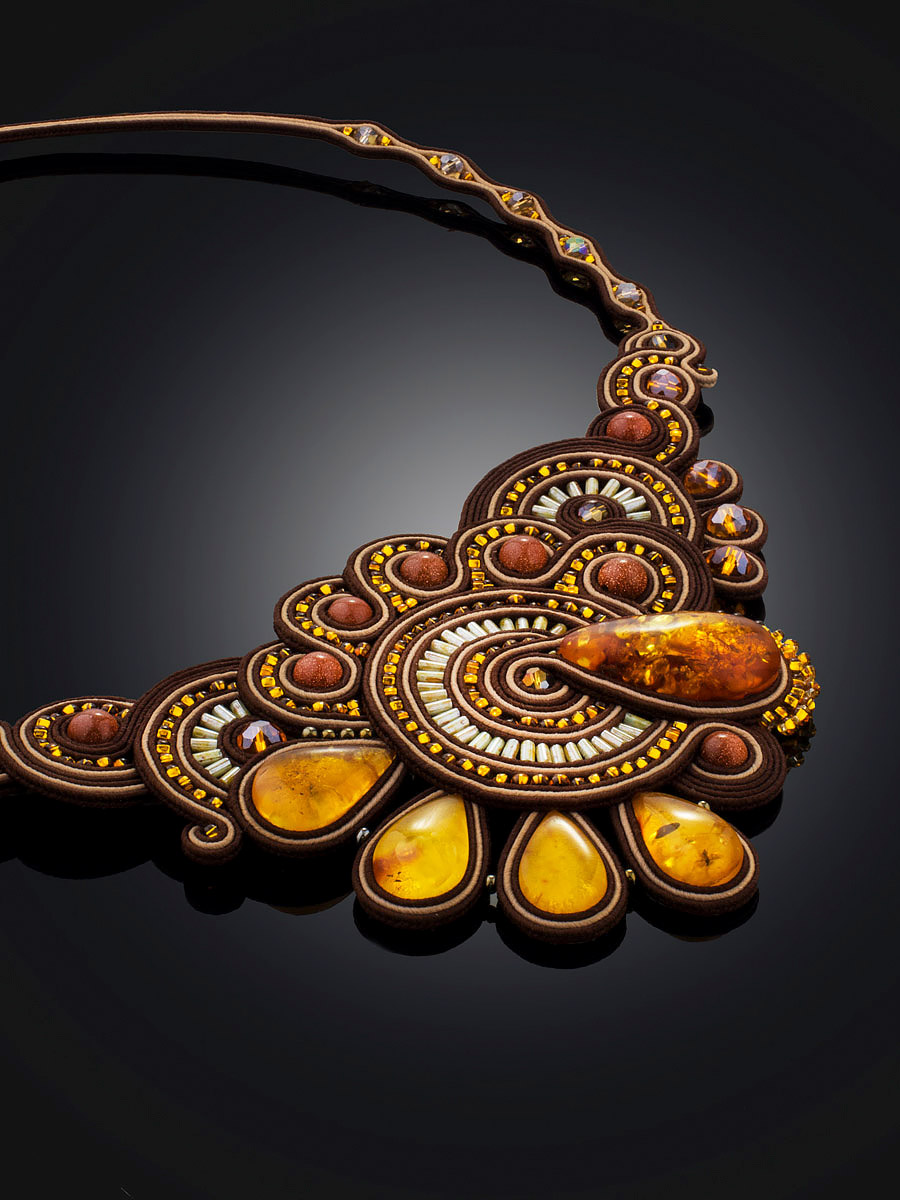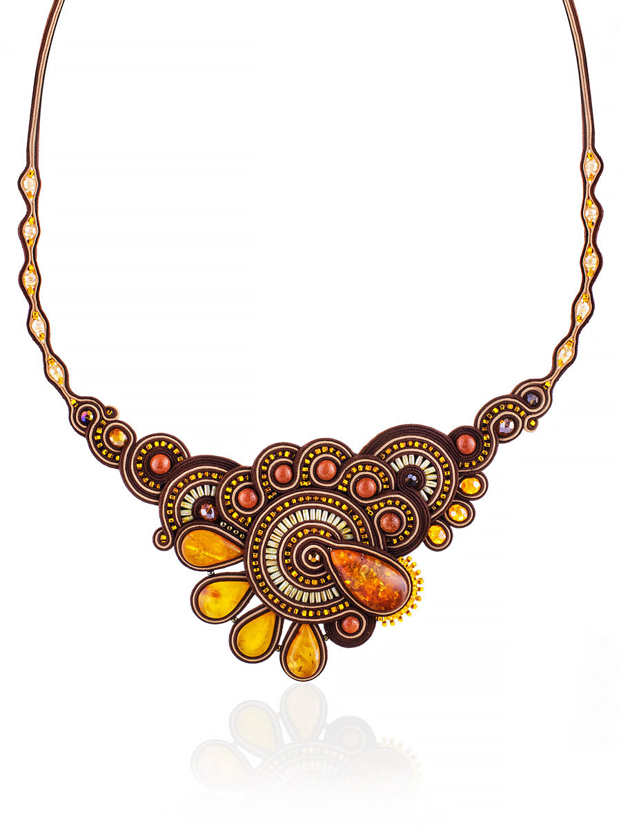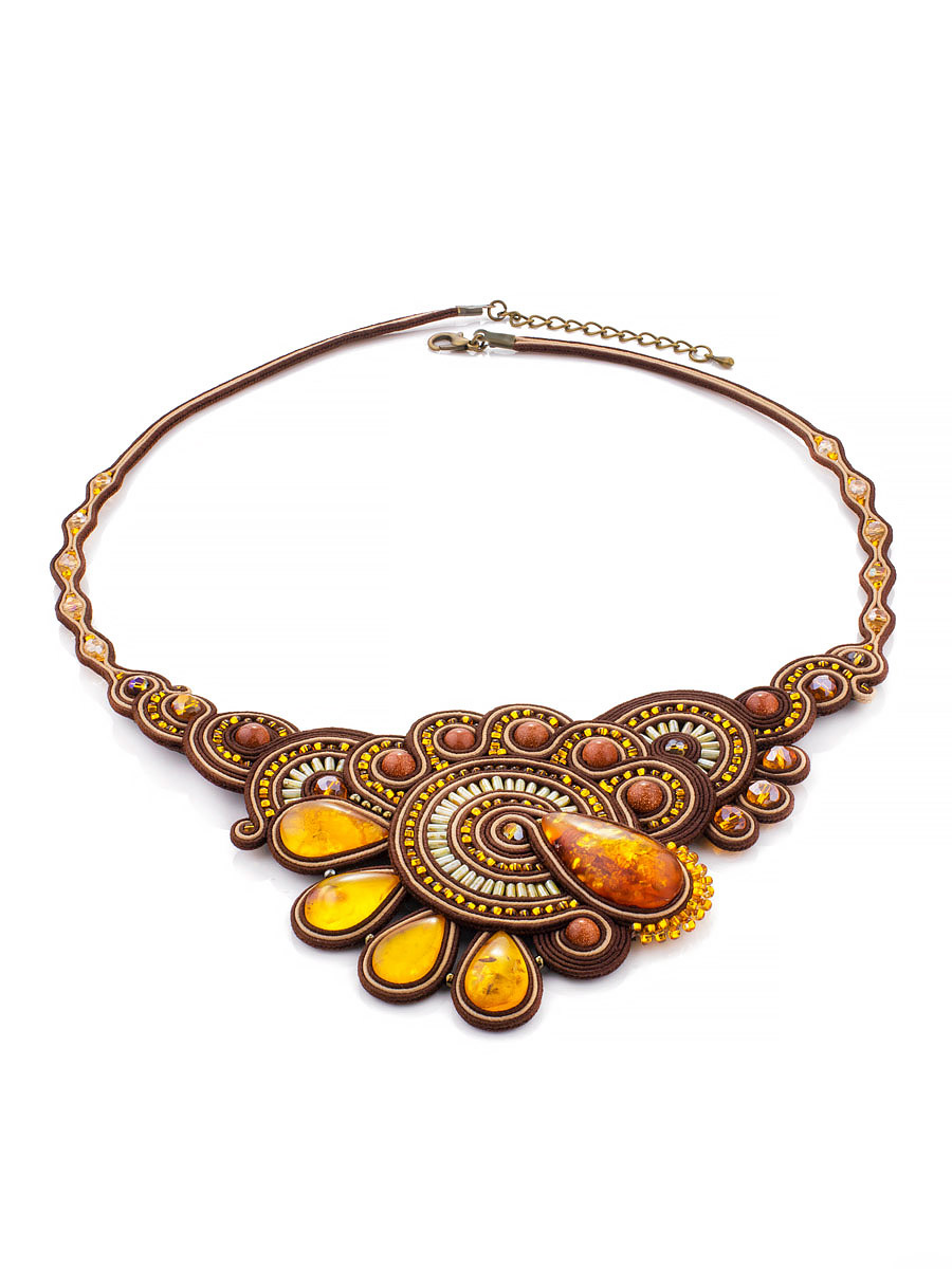 Ажурное колье с элементами плетения и вставками из натурального яркого коньячного янтаря «Индия»