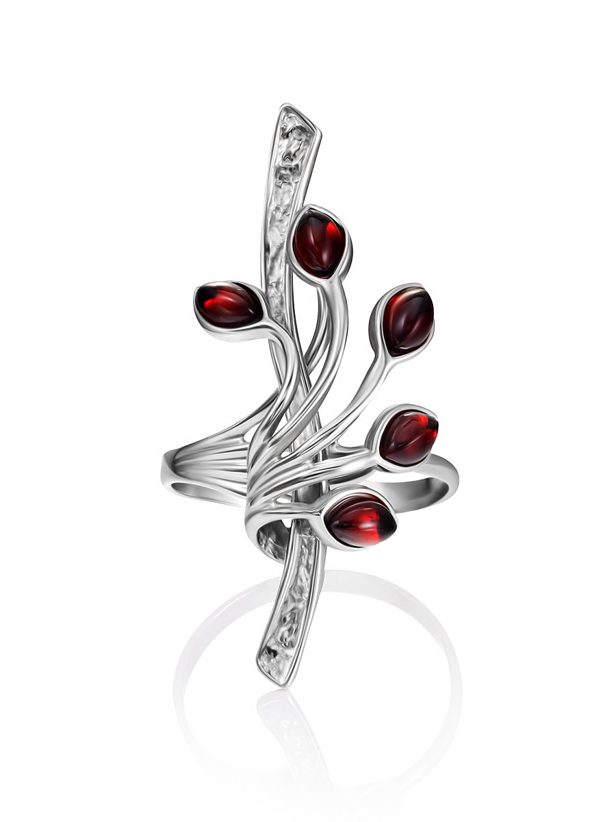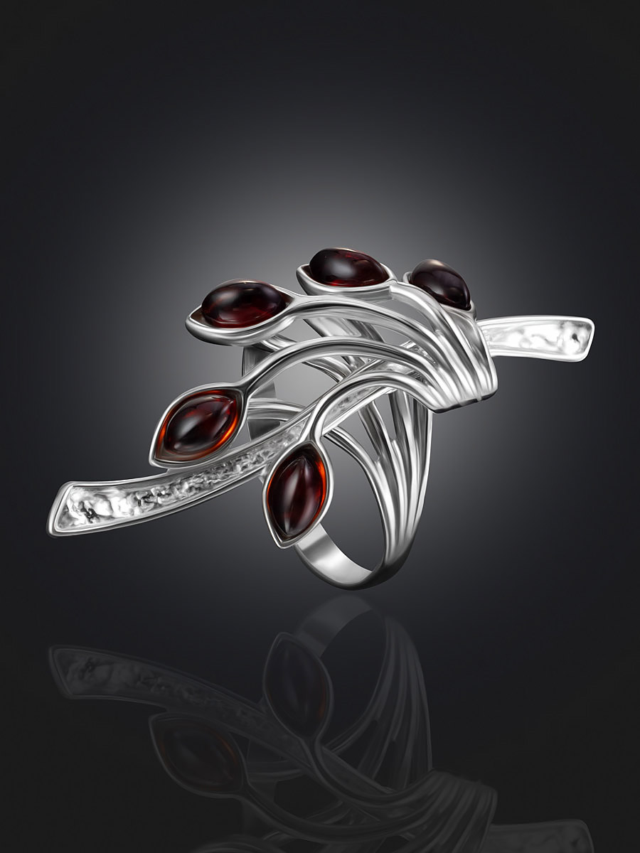 Ажурное нарядное кольцо с натуральным вишнёвым янтарём «Райская птица»