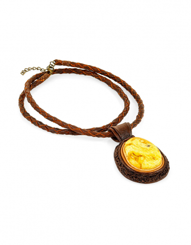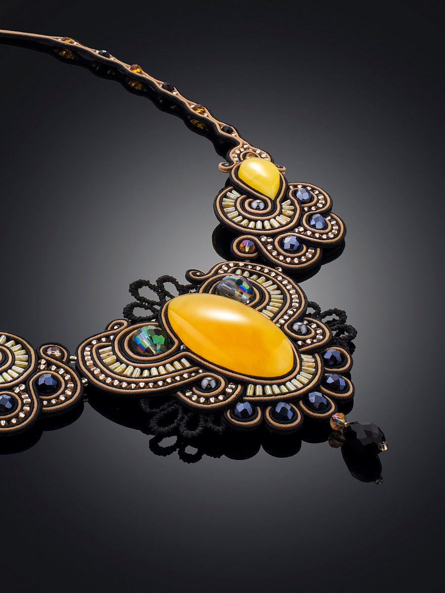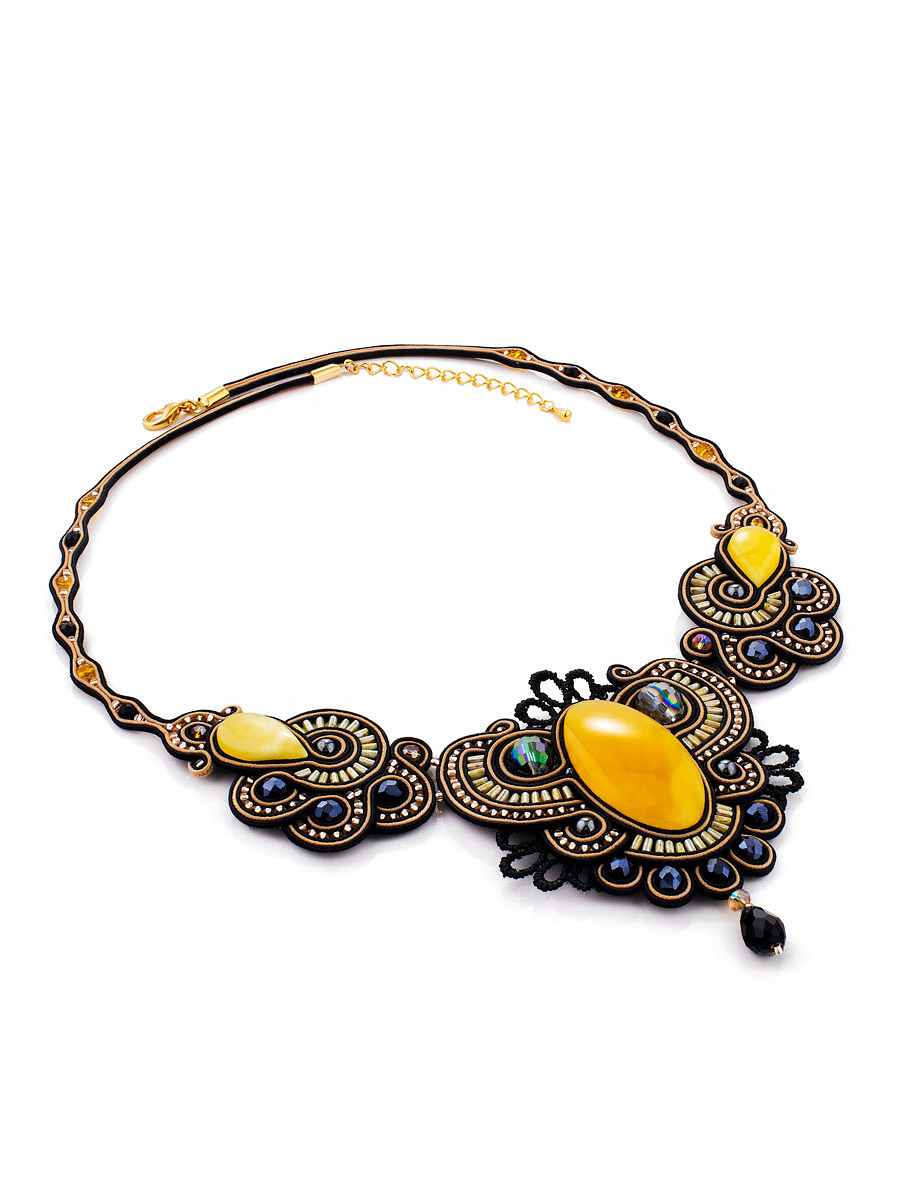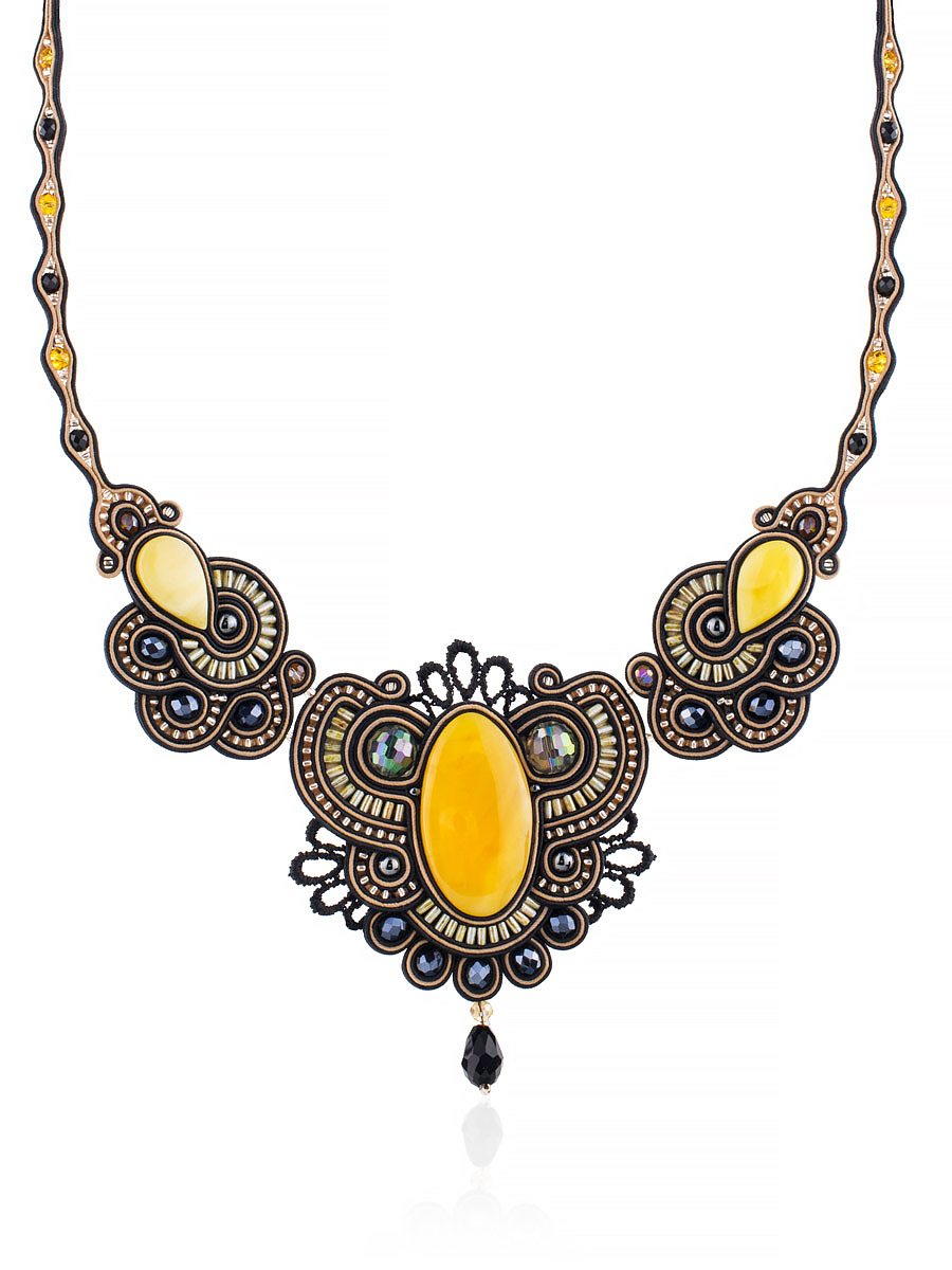 Ажурное плетеное колье с вставками из натурального молочно-белого янтаря «Индия»