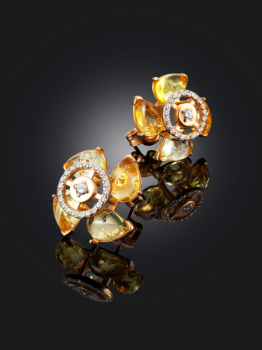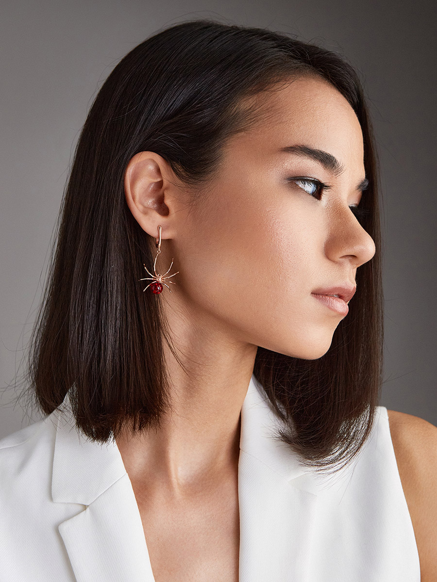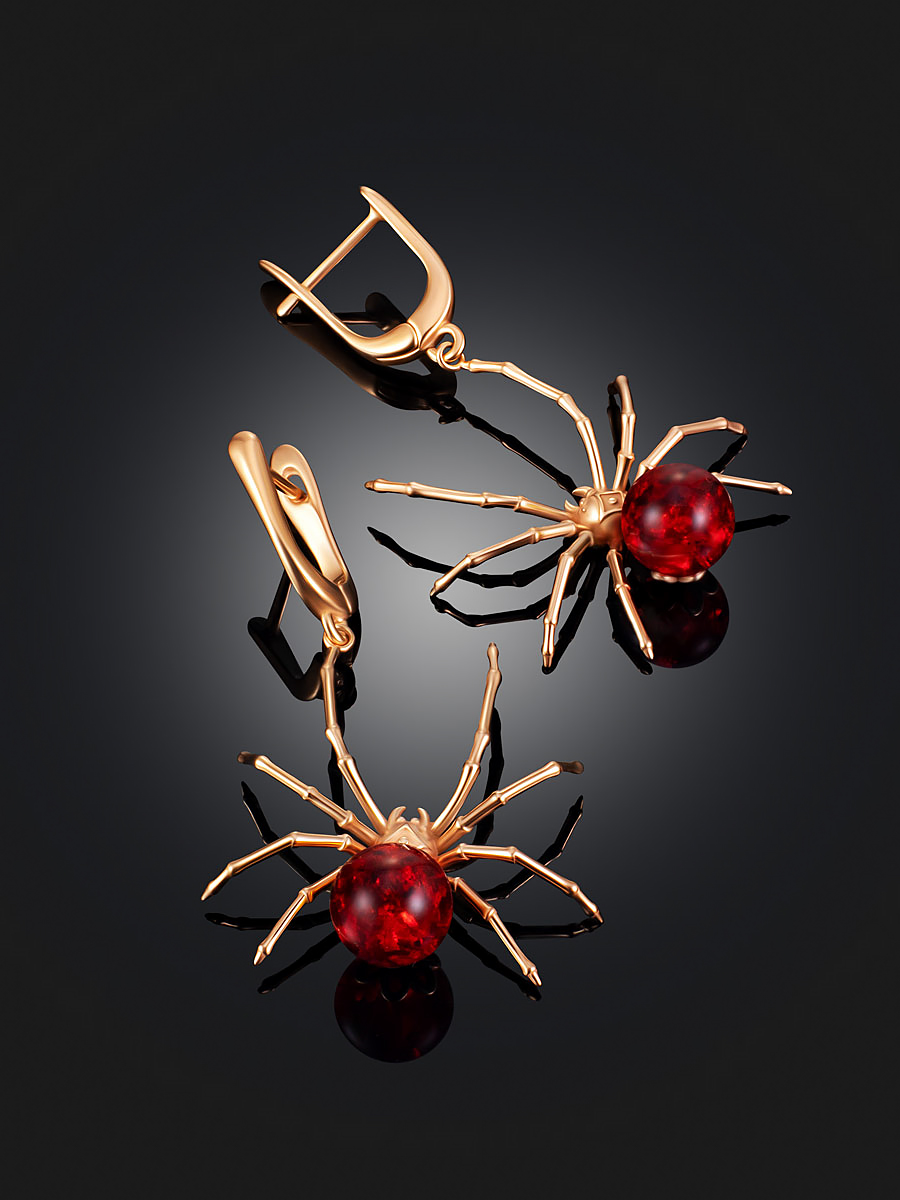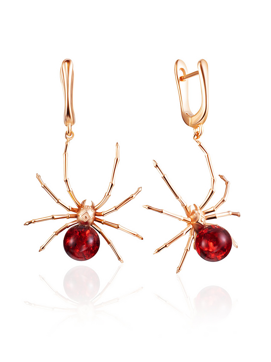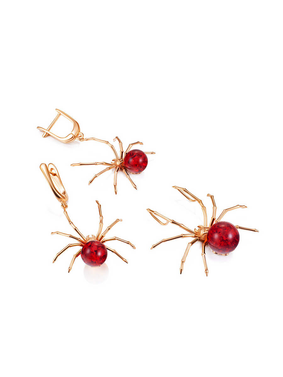 Ажурные лёгкие серьги «Паучок» с янтарём красного цвета