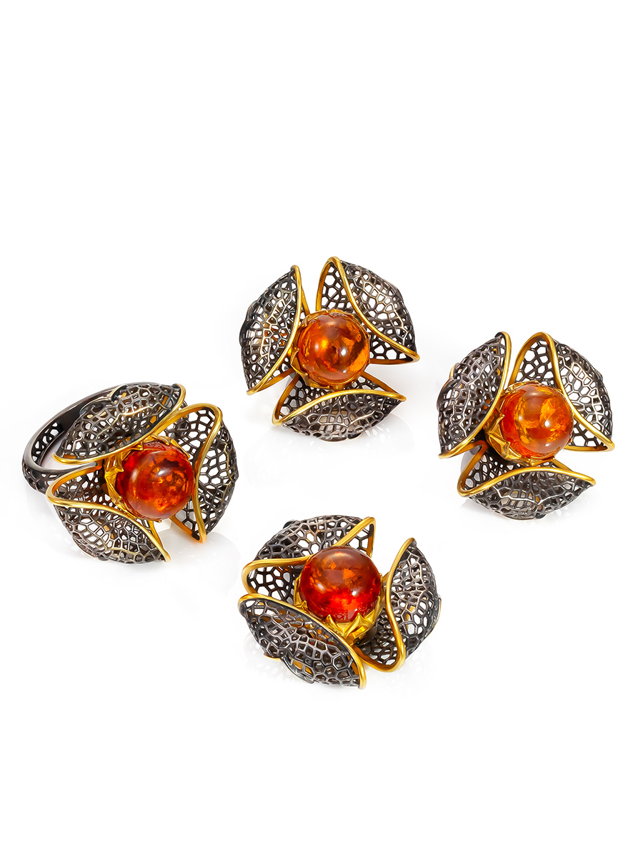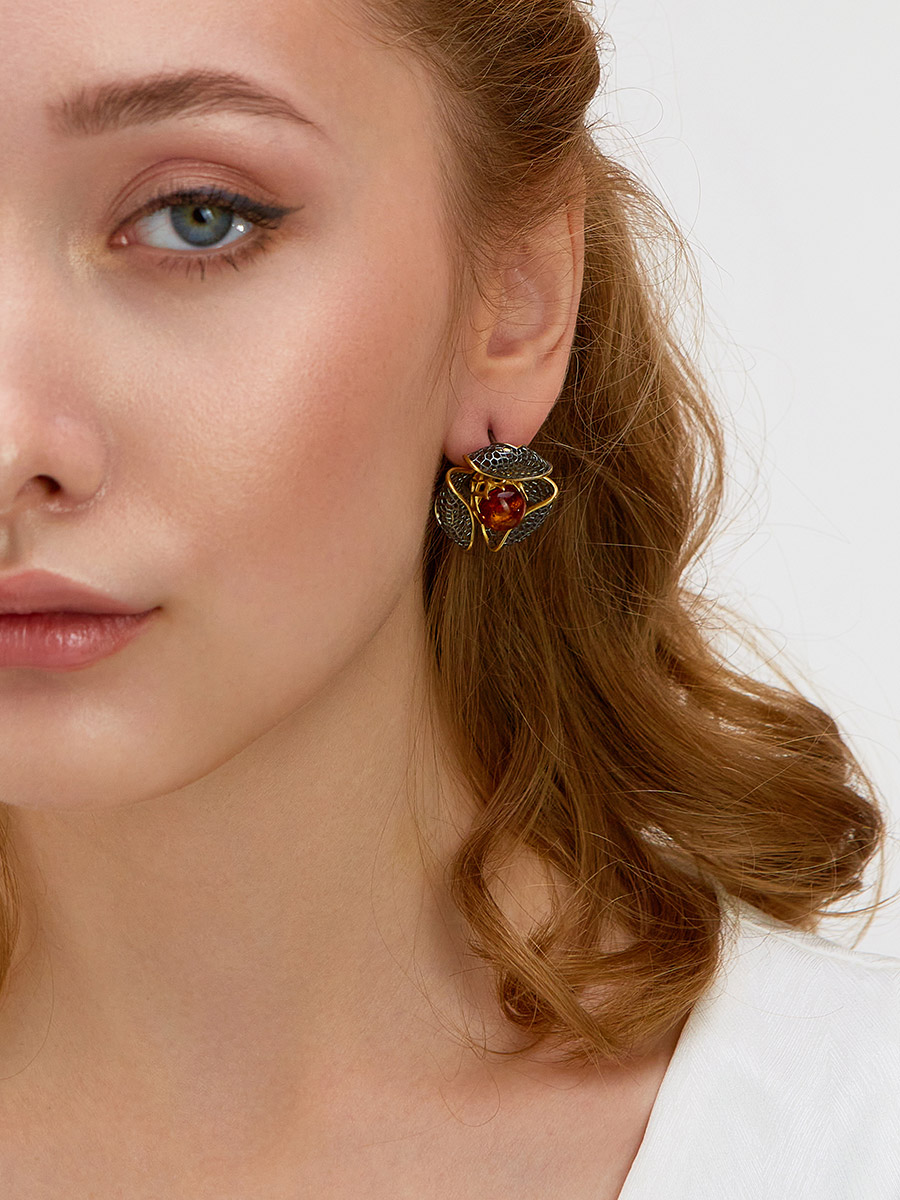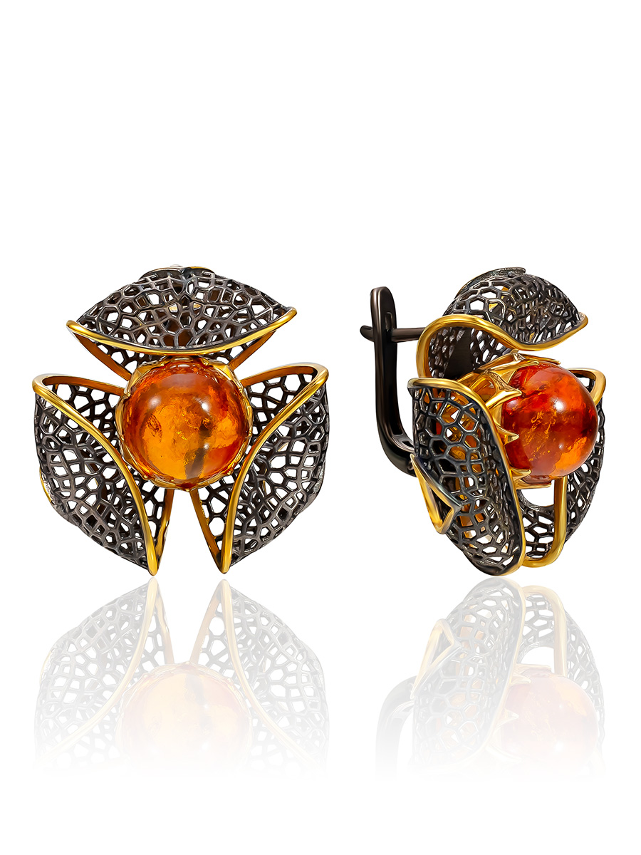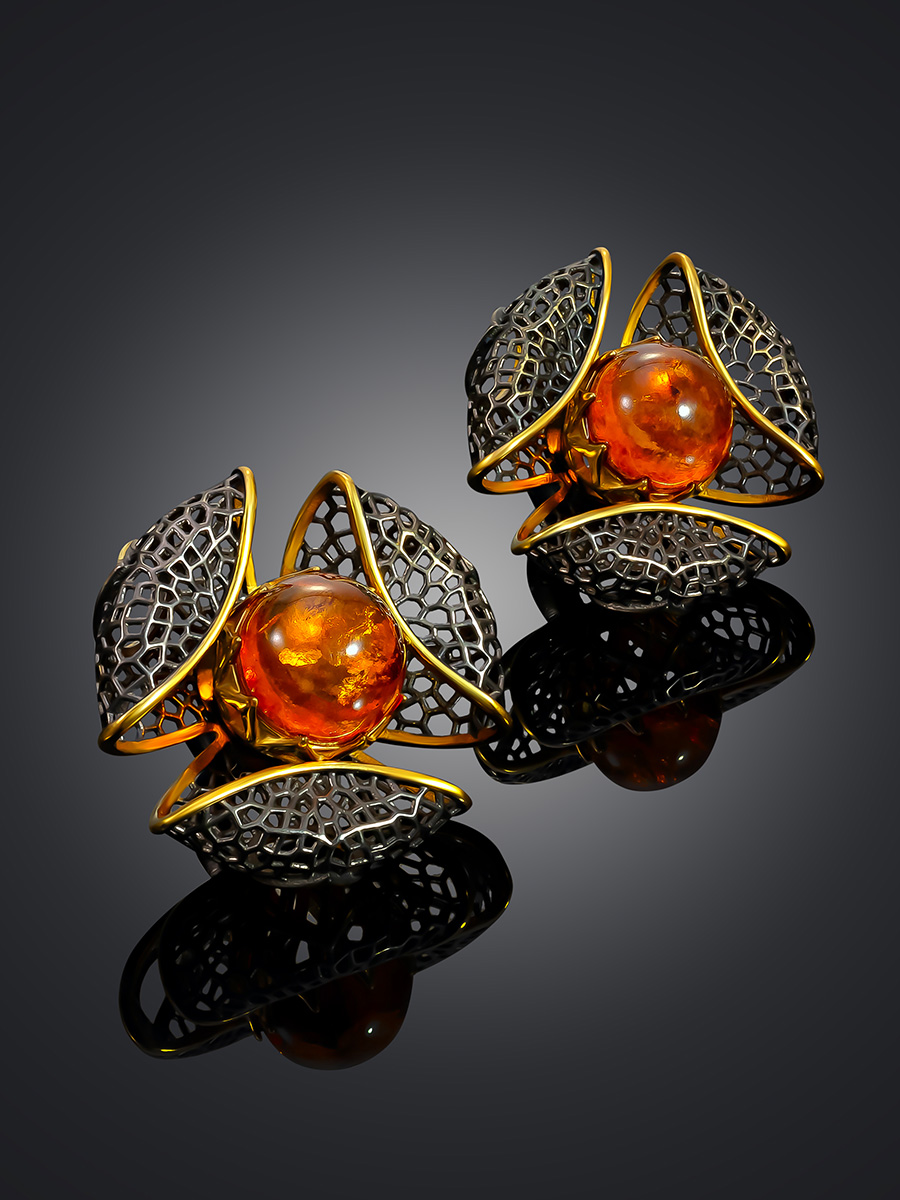 Ажурные серьги «Физалис» с натуральным коньячным янтарём
