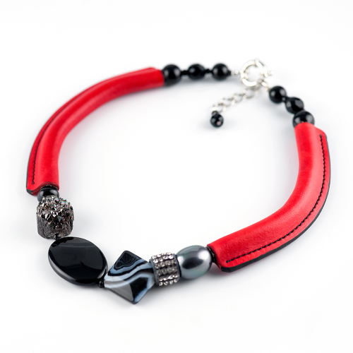 Агат, жемчуг (майорка), натуральная кожа растительного дубления, кристаллы Preciosa, латунь. Гальваническое покрытие: родий.