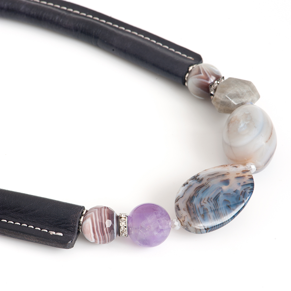 Бразильский агат, аметист, лабрадор, натуральная кожа растительного дубления, кристаллы Preciosa, латунь. Гальваническое покрытие: родий.
