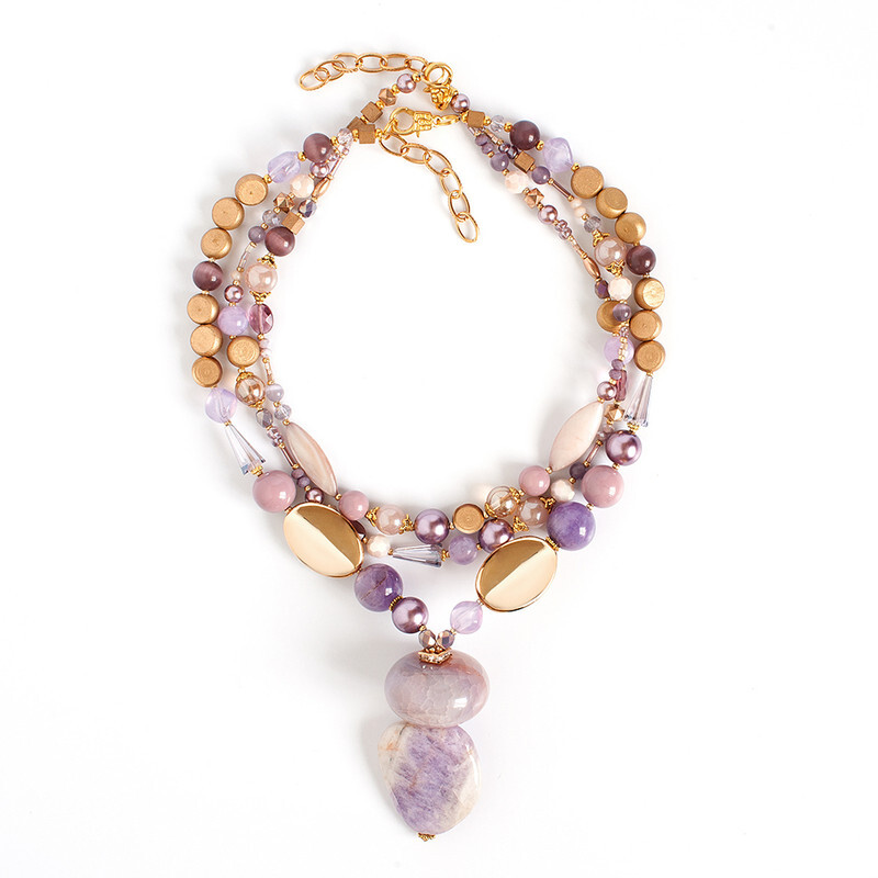 Аметист, агат, жемчуг Majorca, кошачий глаз, палисандровое дерево, кристаллы Preciosa, латунь. Гальваническое покрытие: золото.