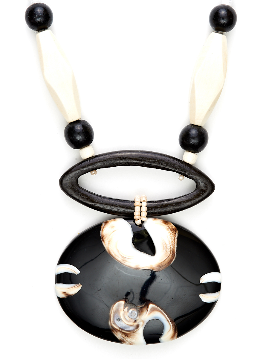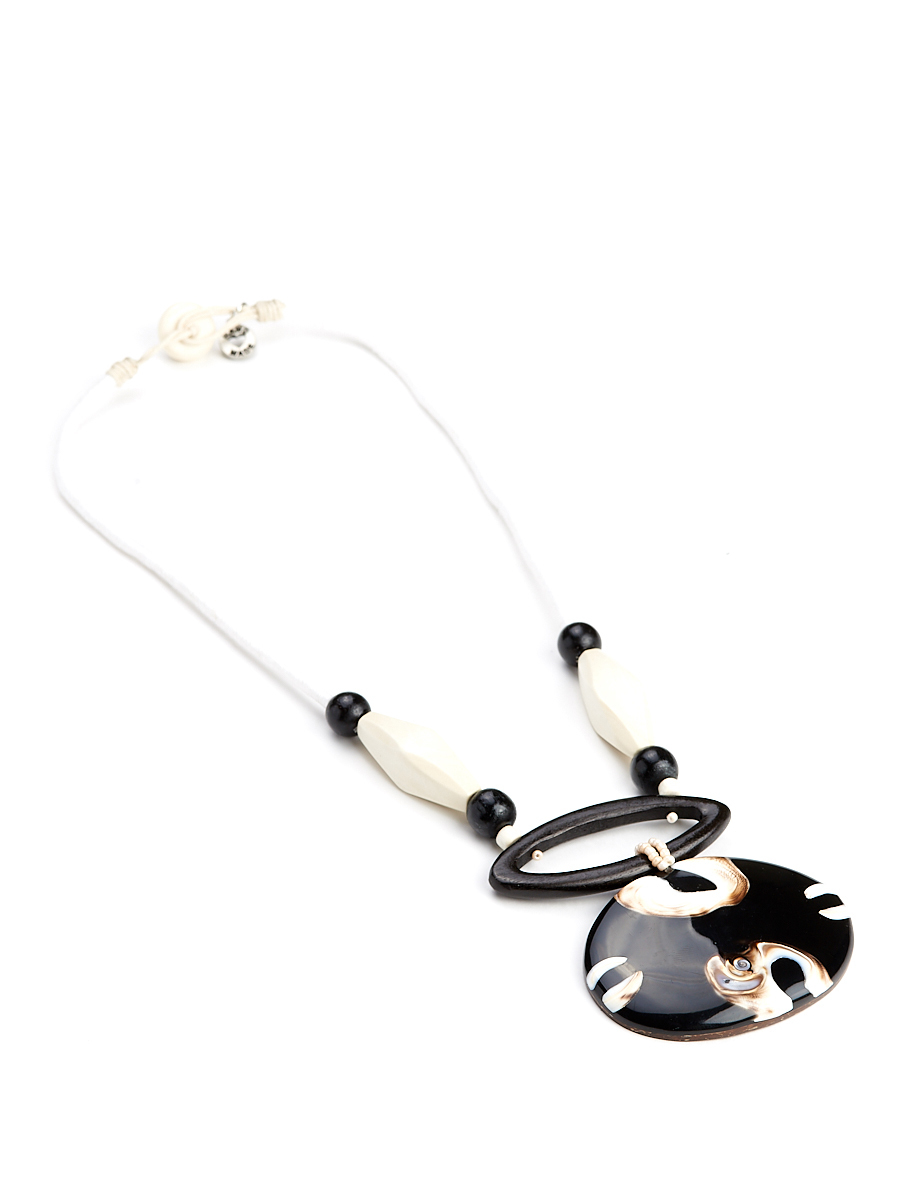 Палисандровое дерево, кокос, натуральный перламутр, бисер, вощеный шнурок, латунь. Гальваническое покрытие: родий.